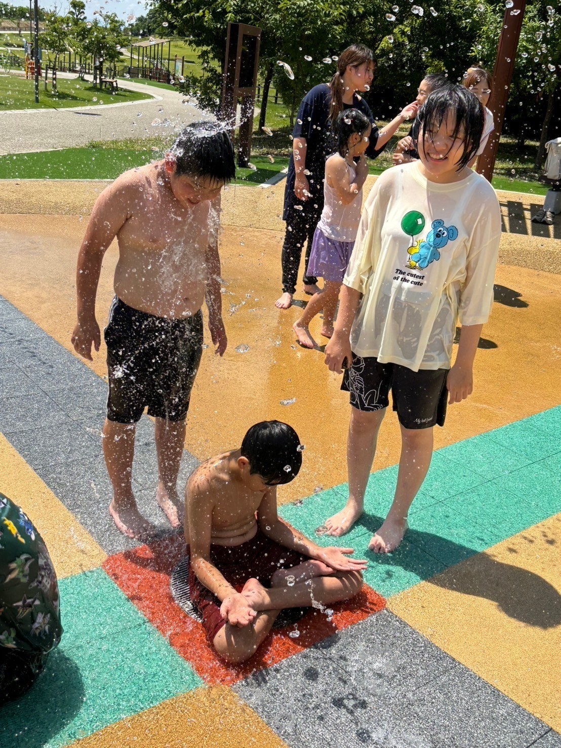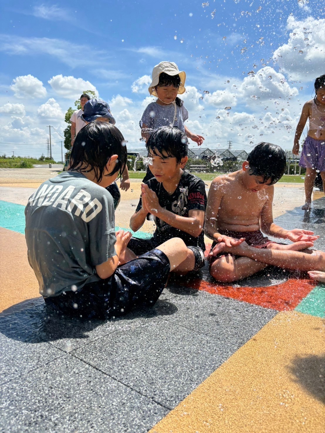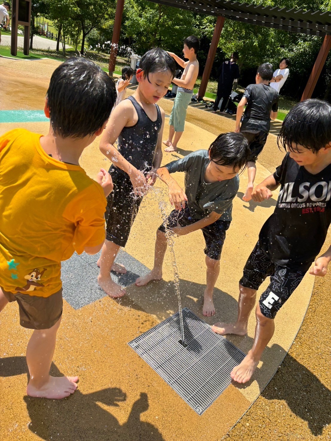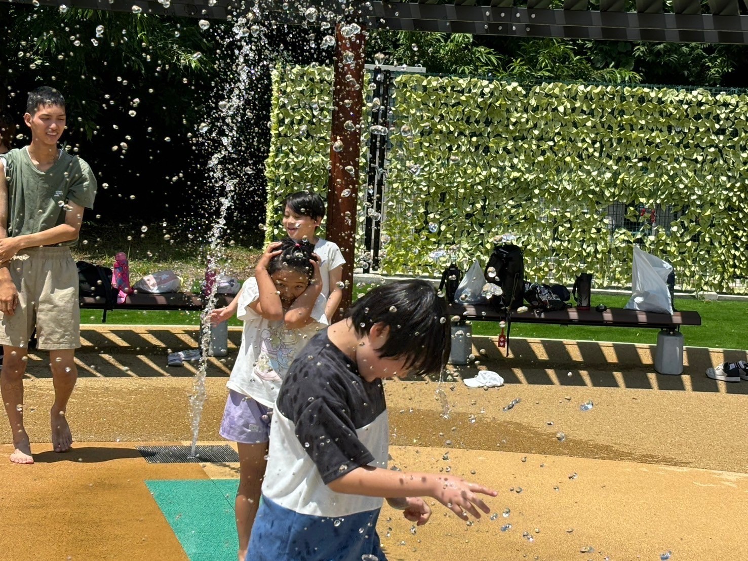 この日は着替えを持ち水遊びへ!勢いよく噴水が出る遊び場で、「ひゃ〜!つめたーい!」と