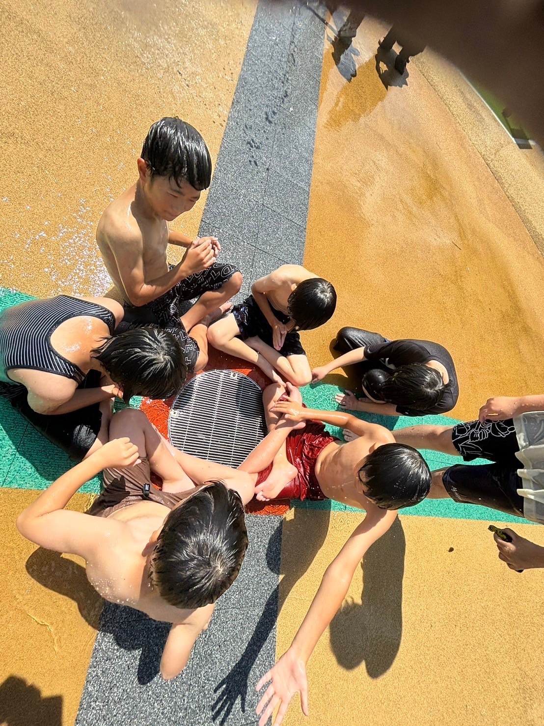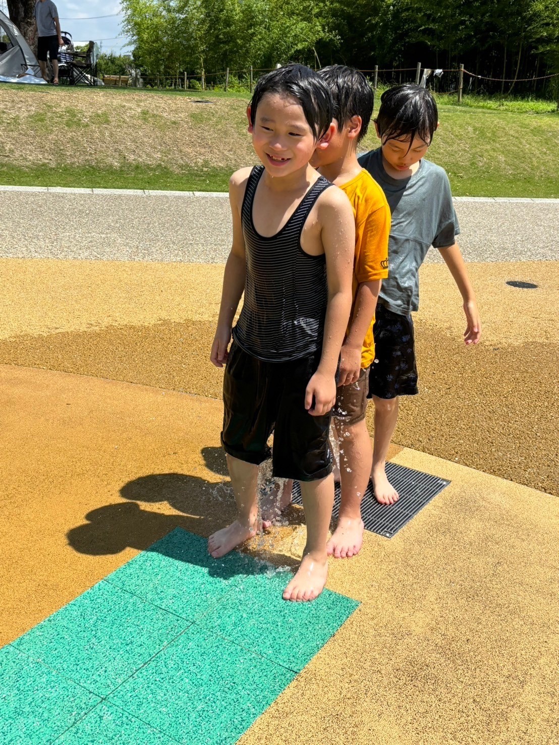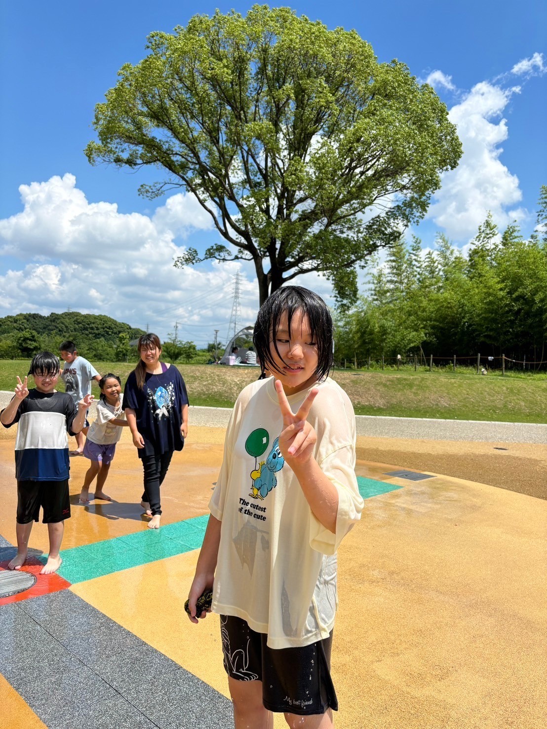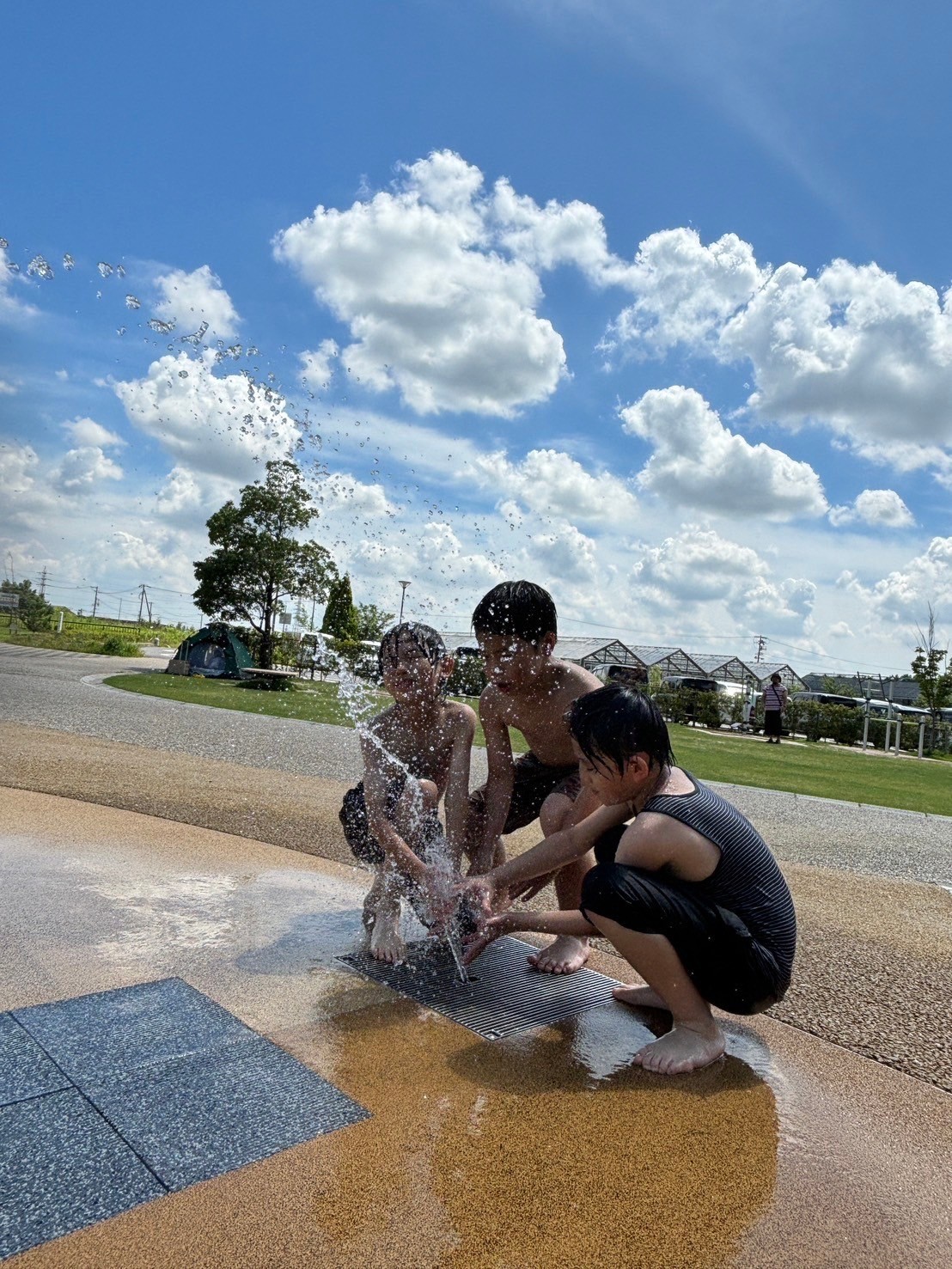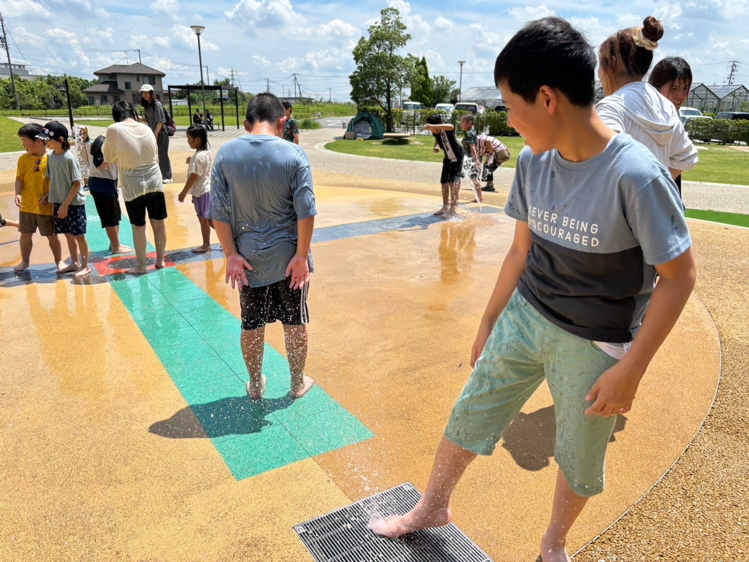 この日は着替えを持ち水遊びへ!勢いよく噴水が出る遊び場で、「ひゃ〜!つめたーい!」と