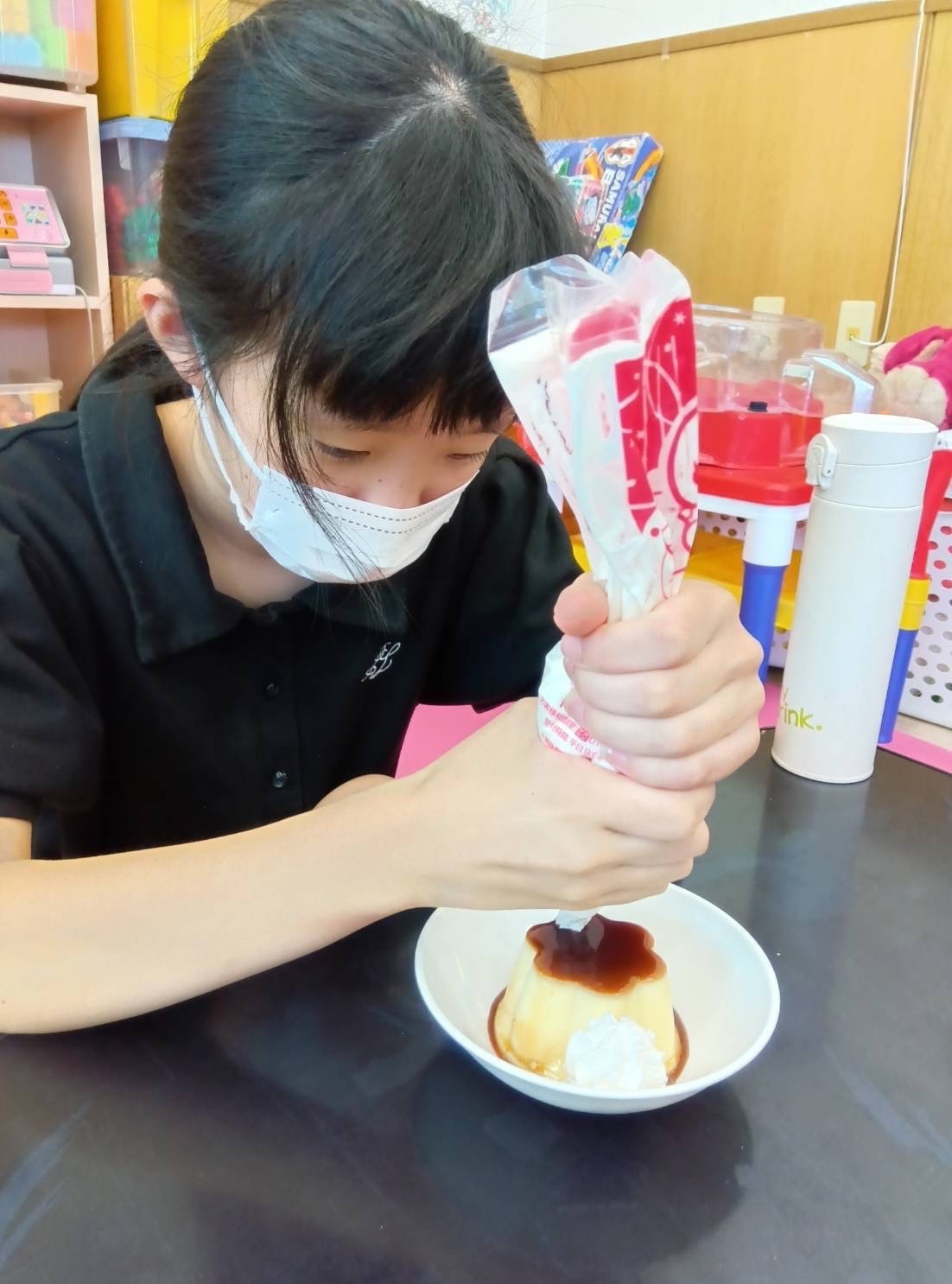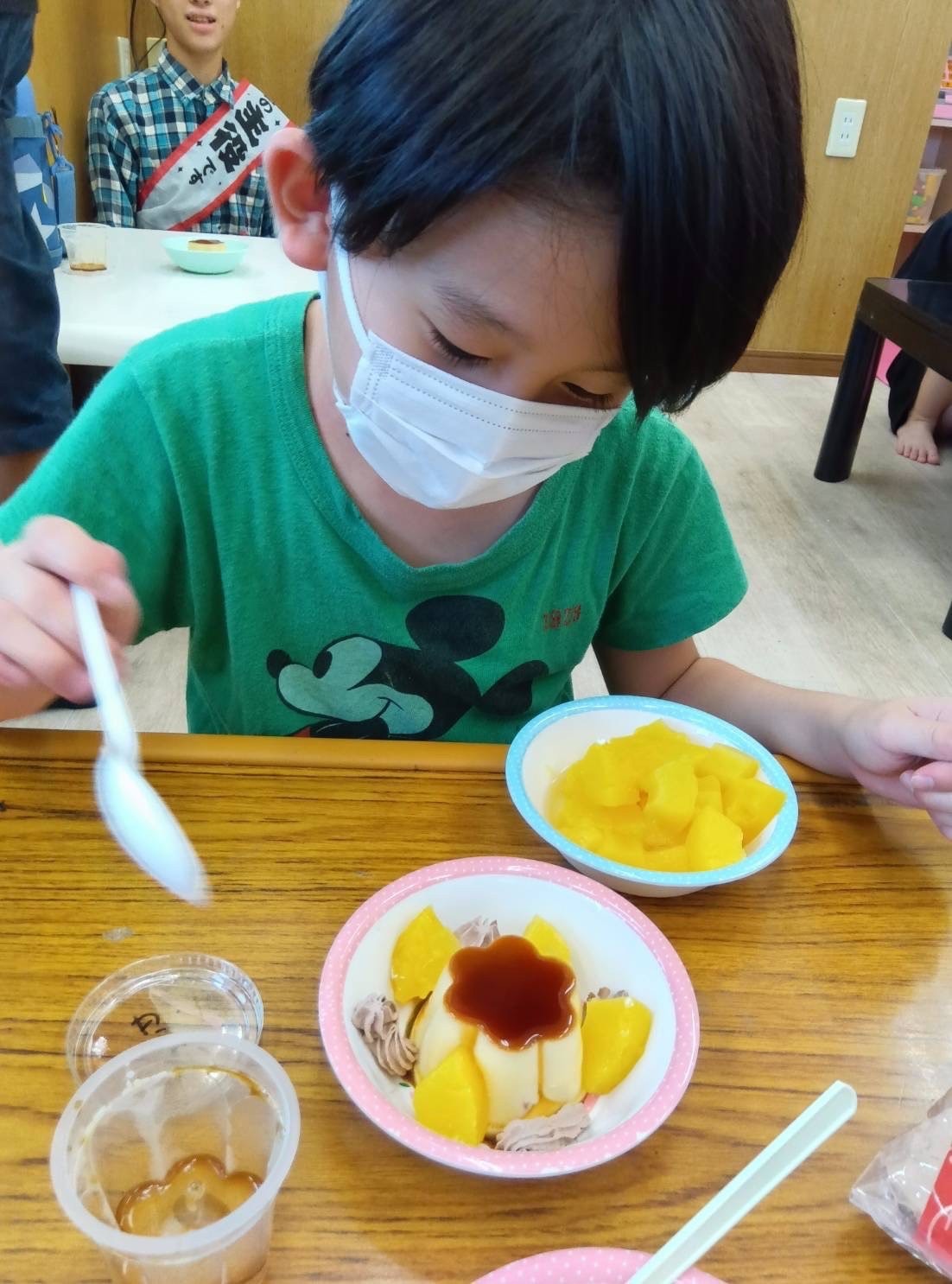 おやつには午前中作ったプリンをぷっちんして、デコレーションしていただきます🎵