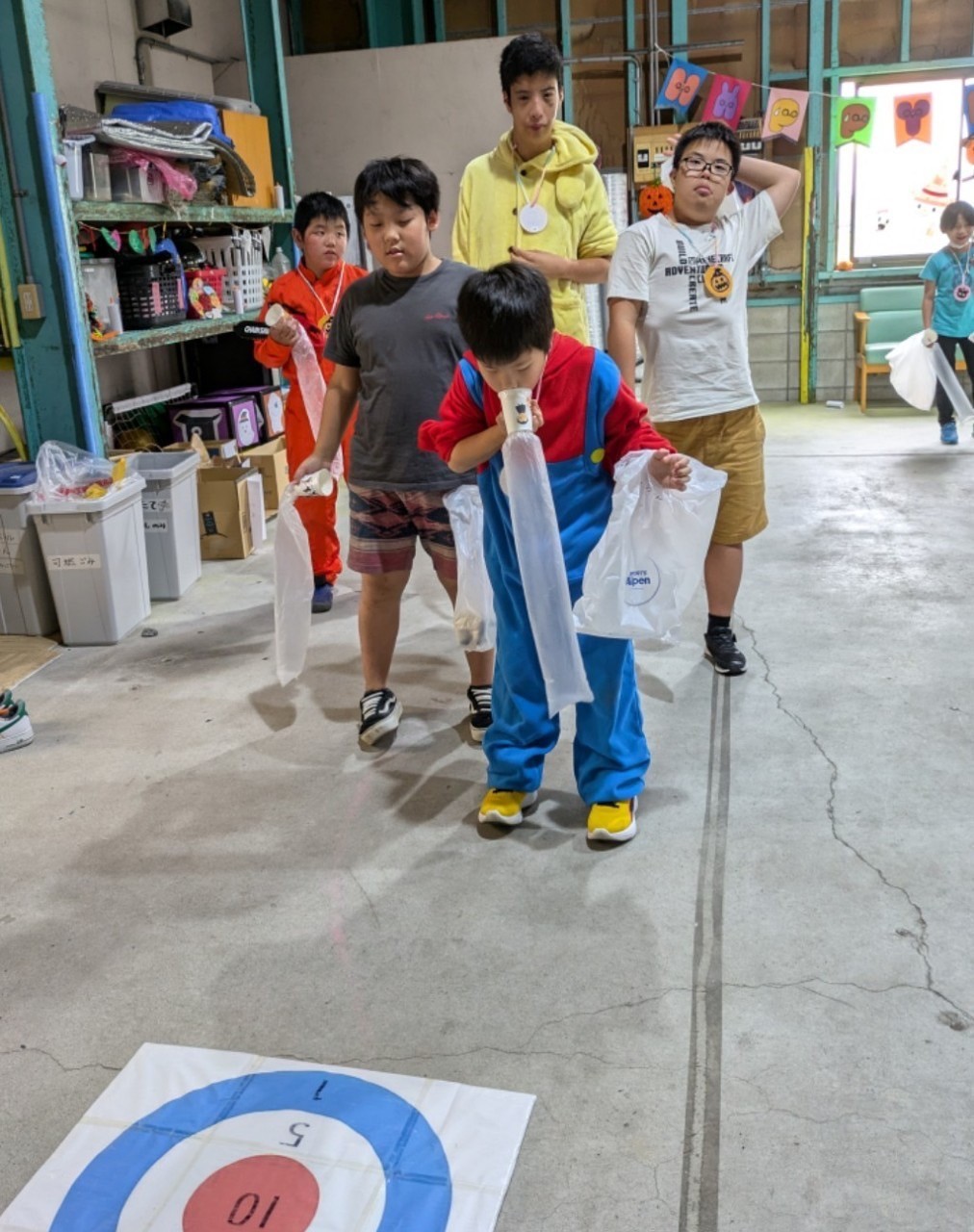 袋のついた紙コップに息を吹き入れ、的に向かって投げます!