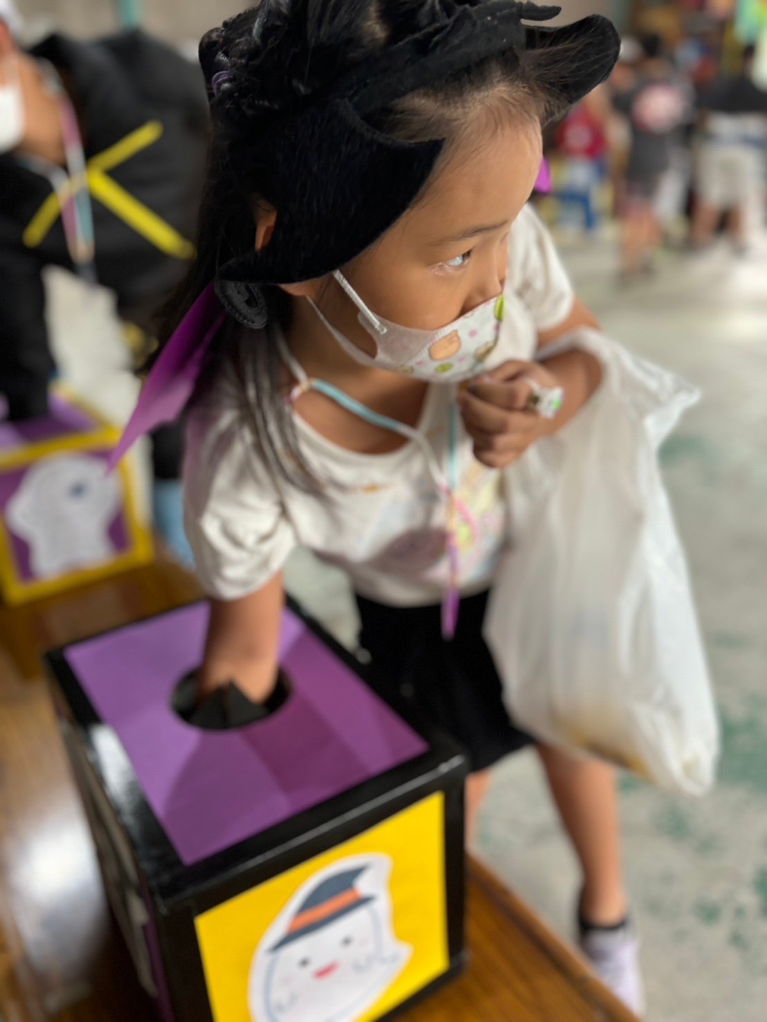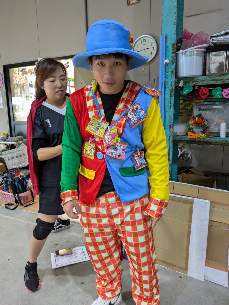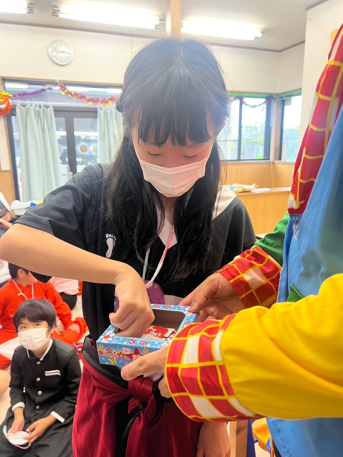 着ぐるみを着たスタッフの体についているお菓子の詰め合わせを取ります!
