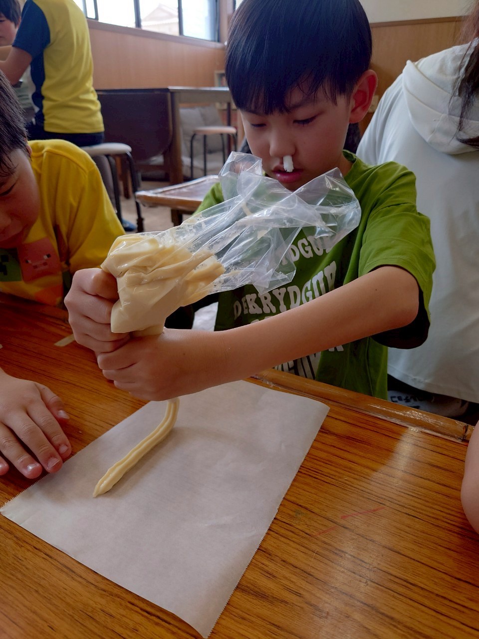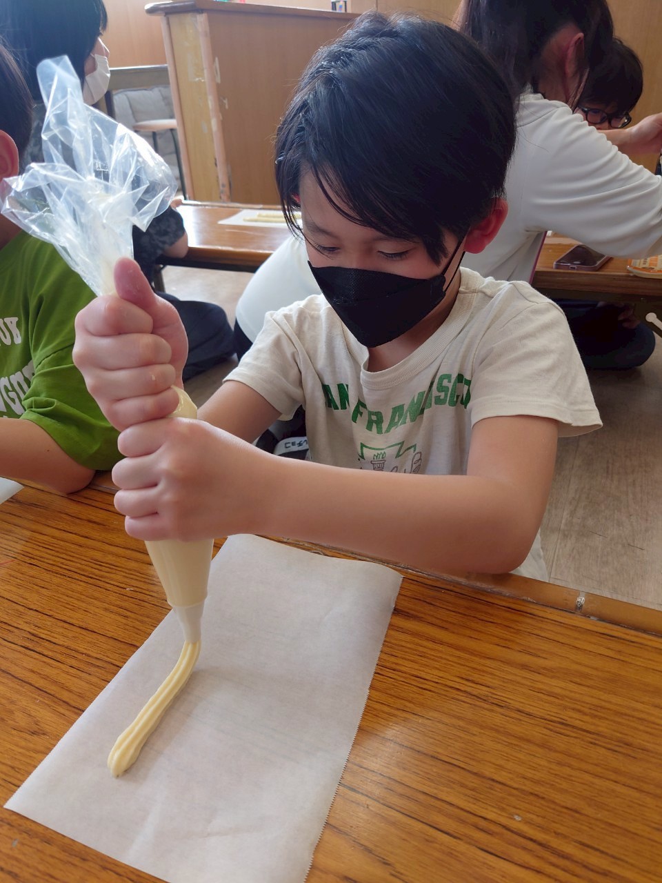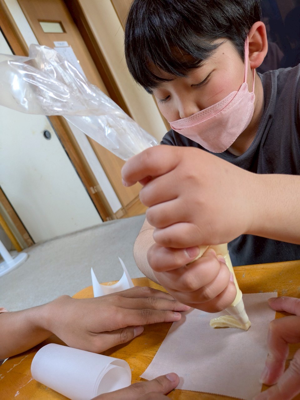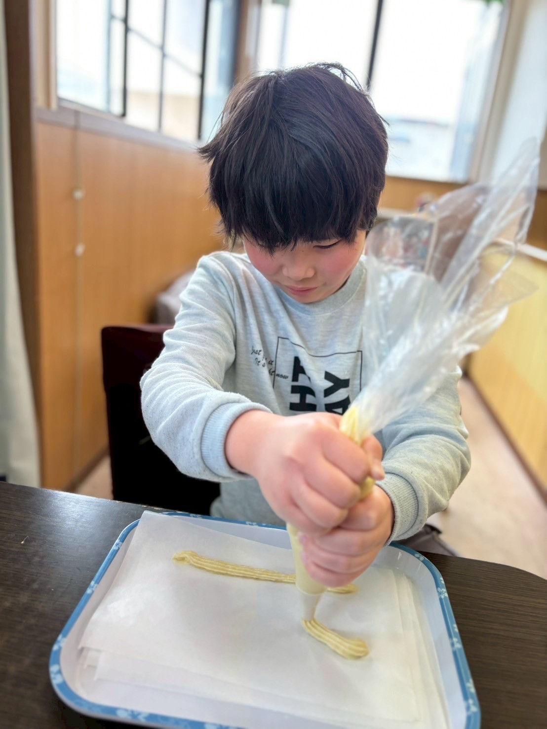 しっかり混ざったら、絞り袋に生地を入れて、1人2本クッキングシートに絞り出していきます🎶