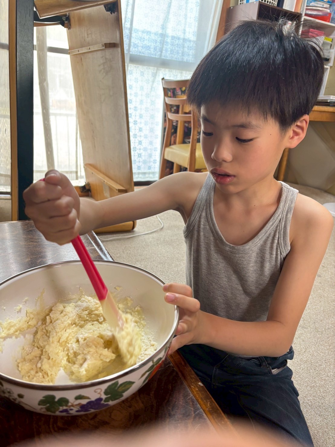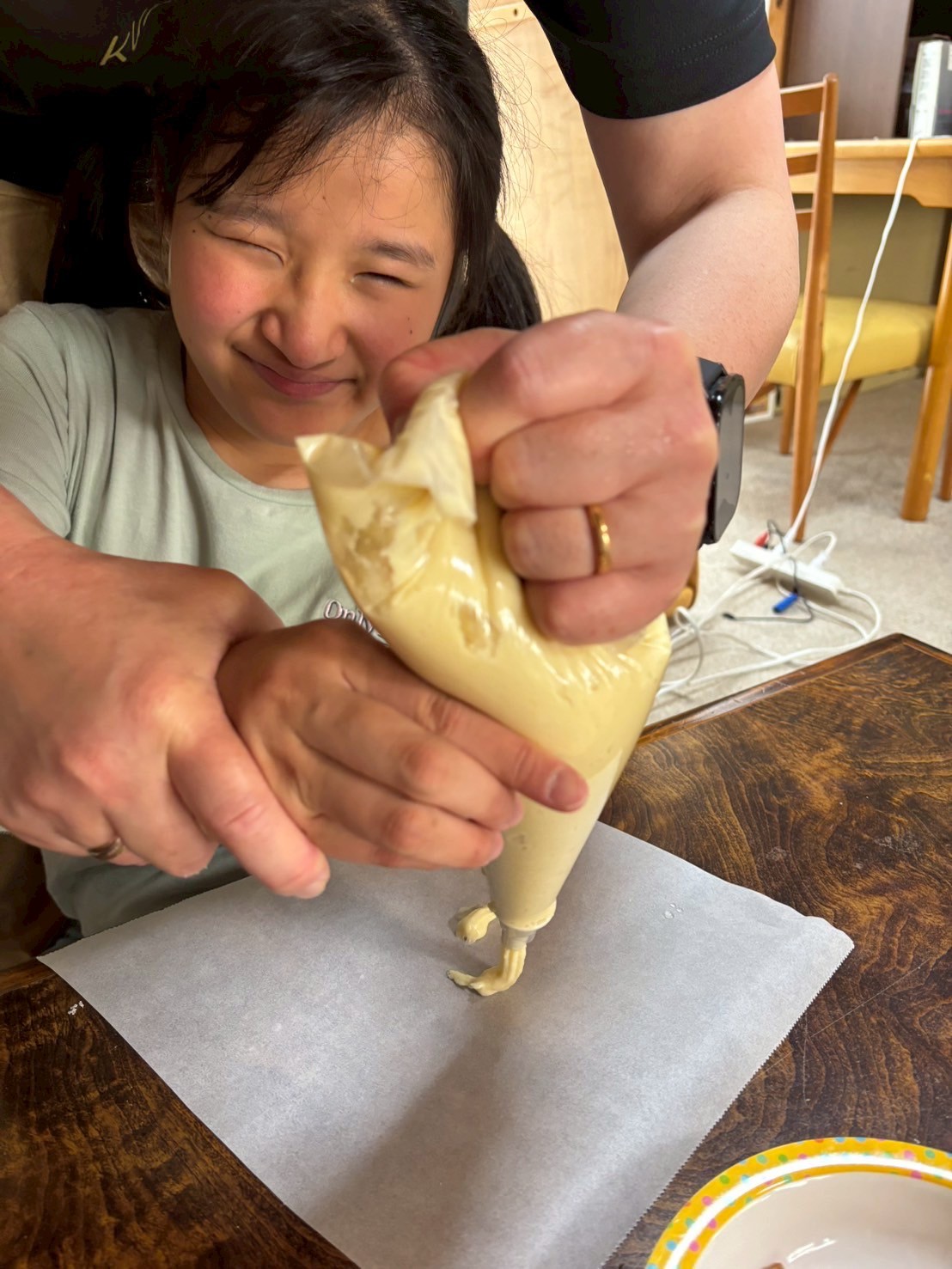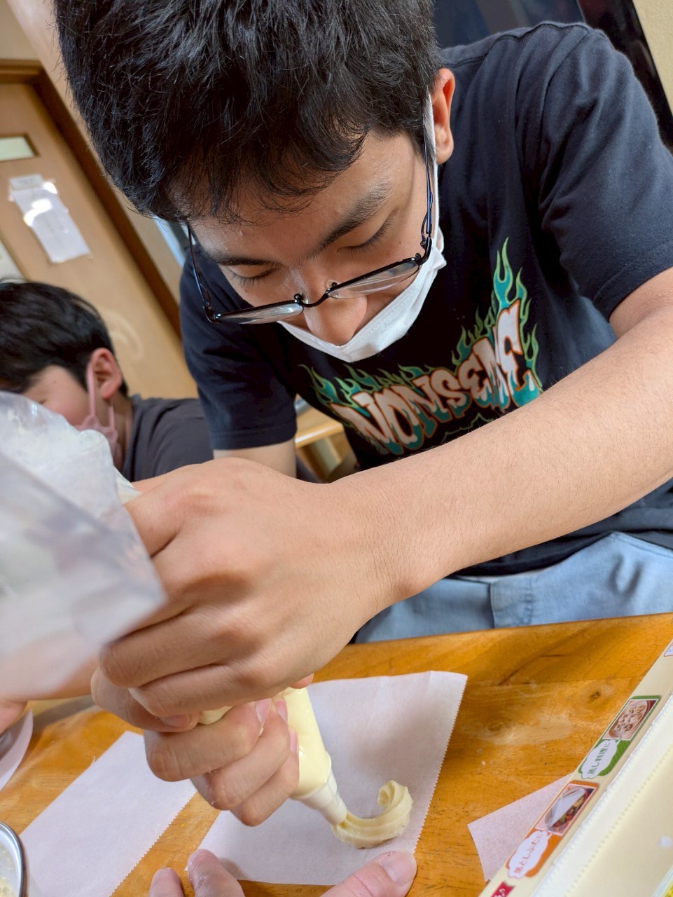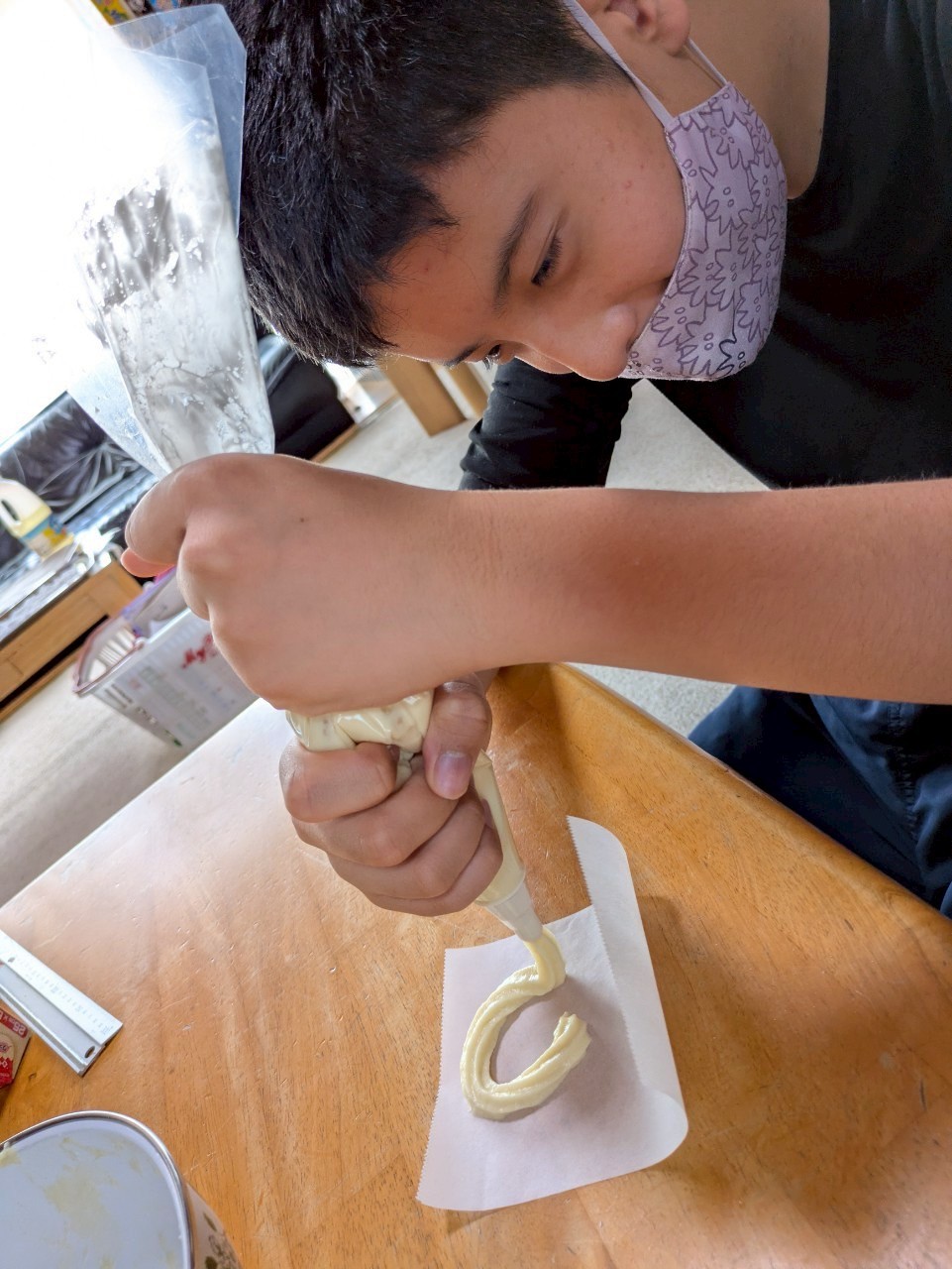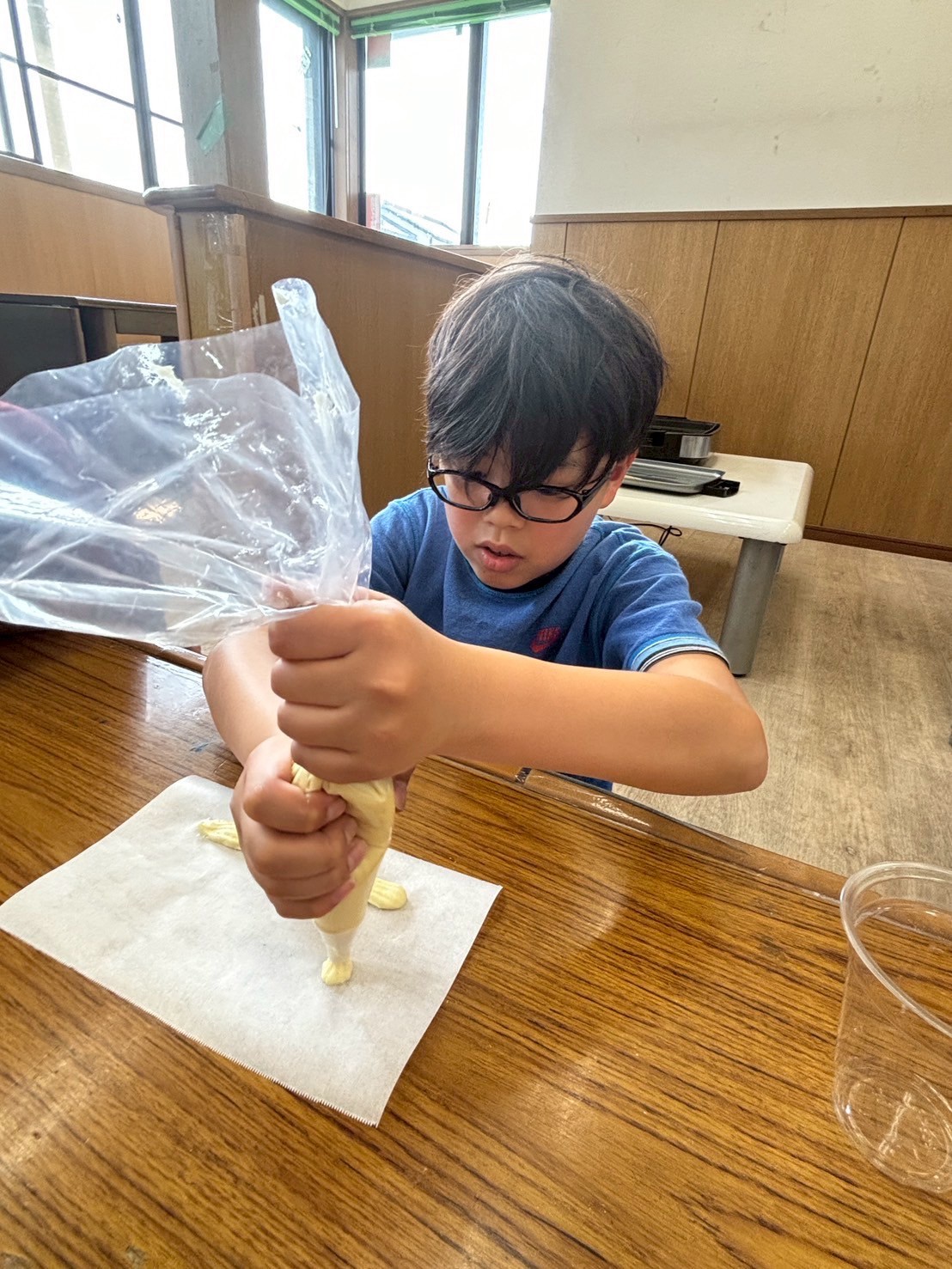 しっかり混ざったら、絞り袋に生地を入れて、1人2本クッキングシートに絞り出していきます🎶