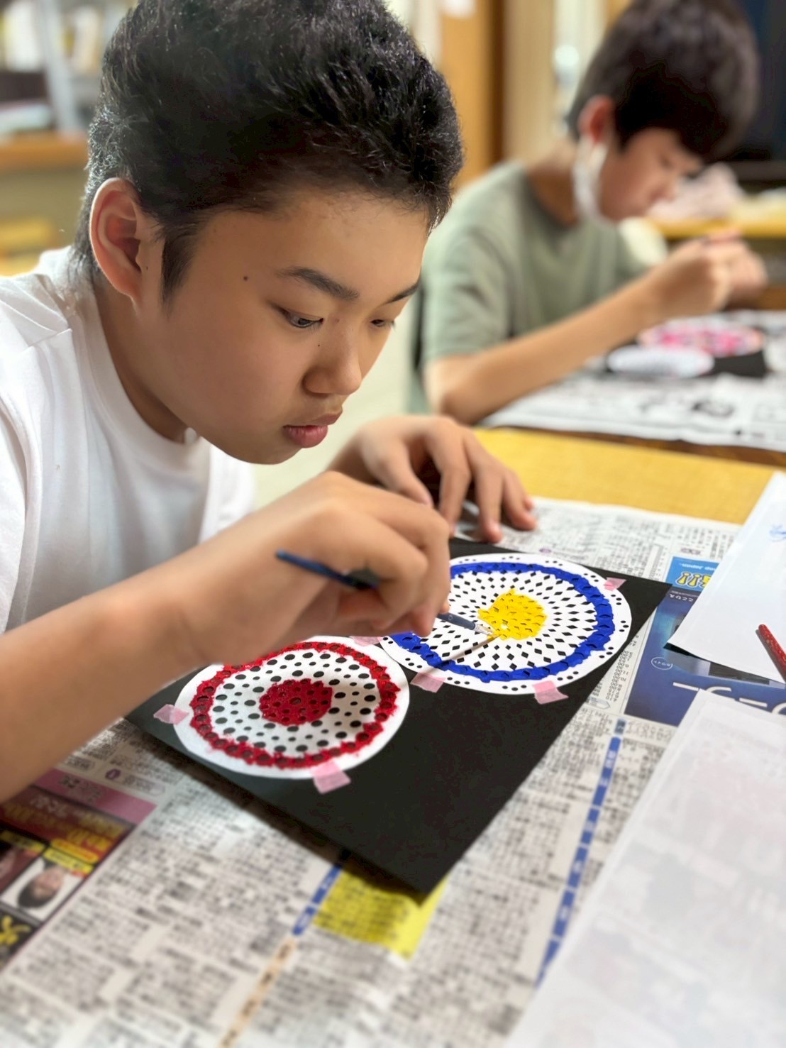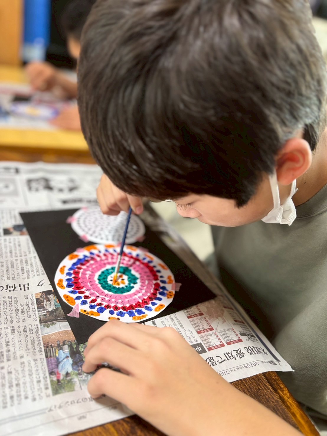 シートを画用紙にぴったり当てたら、細かい穴を埋めるように、上から好きな色を乗せていきます🎶