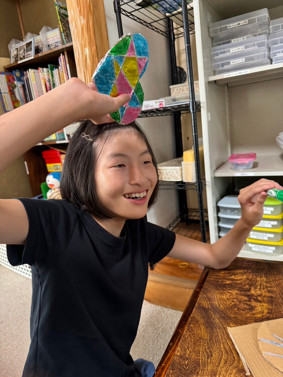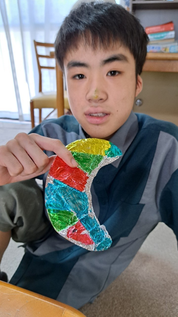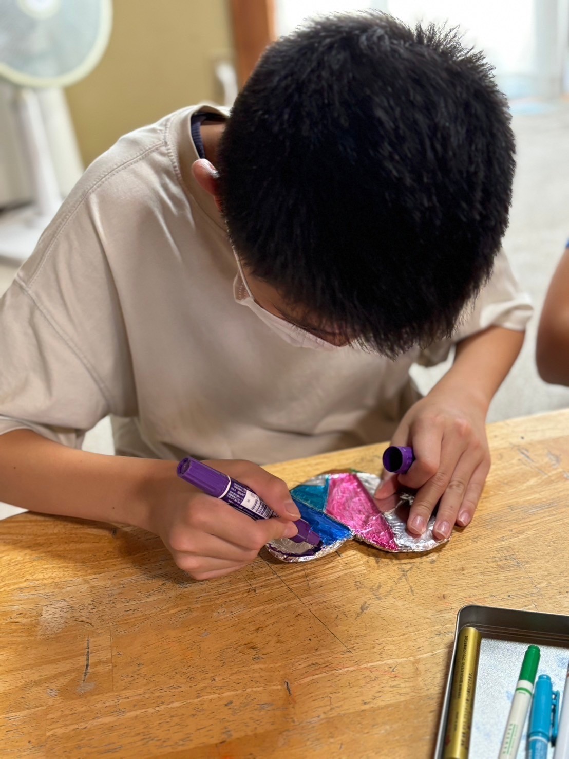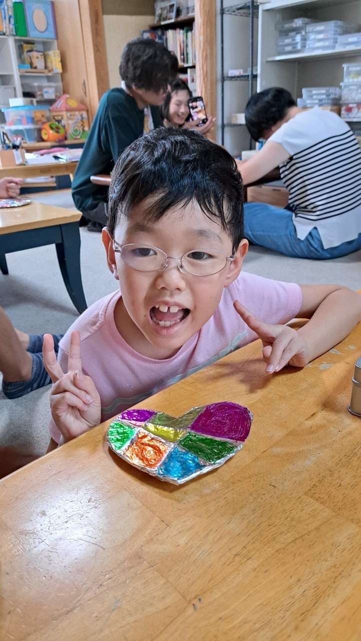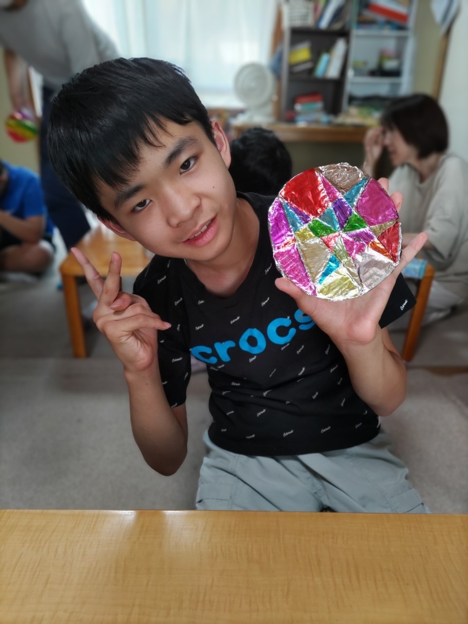 豊明は、午後からアルミホイルを使ってステンドグラスアートを作りました⭐️
