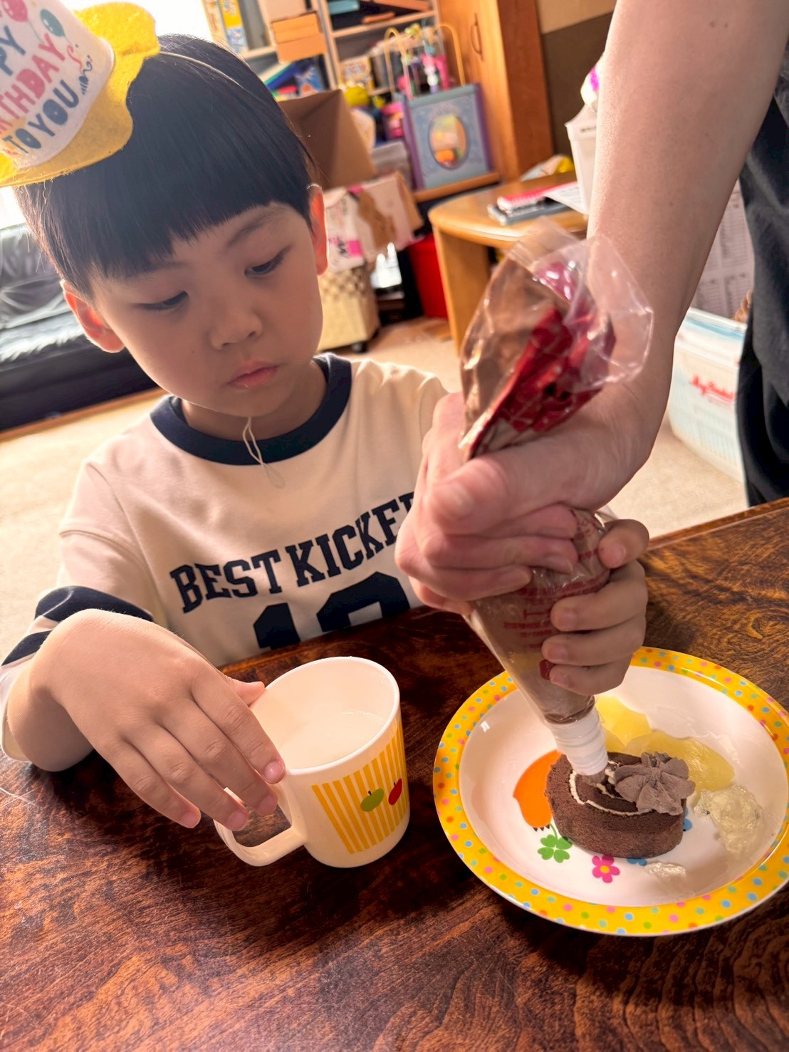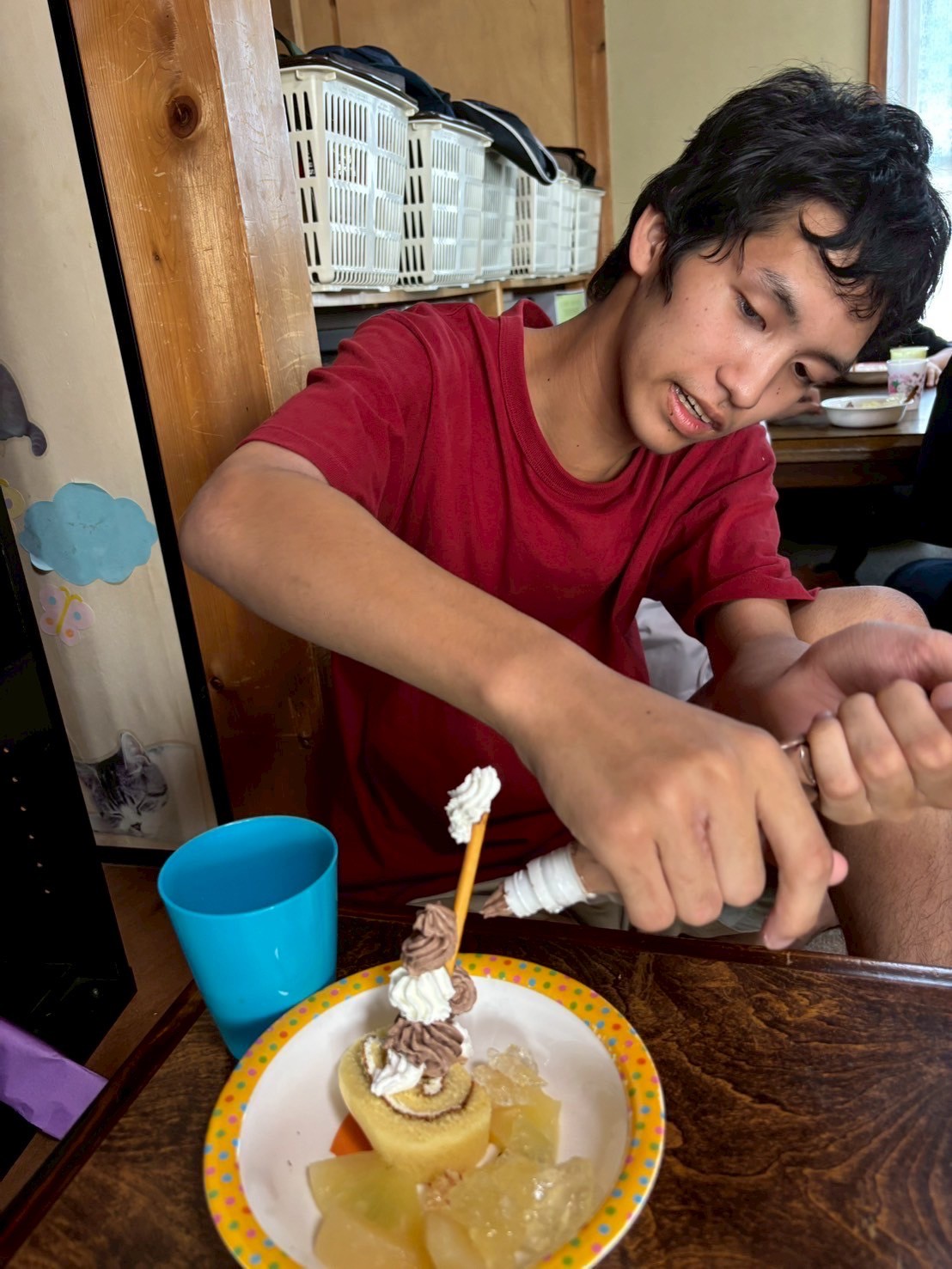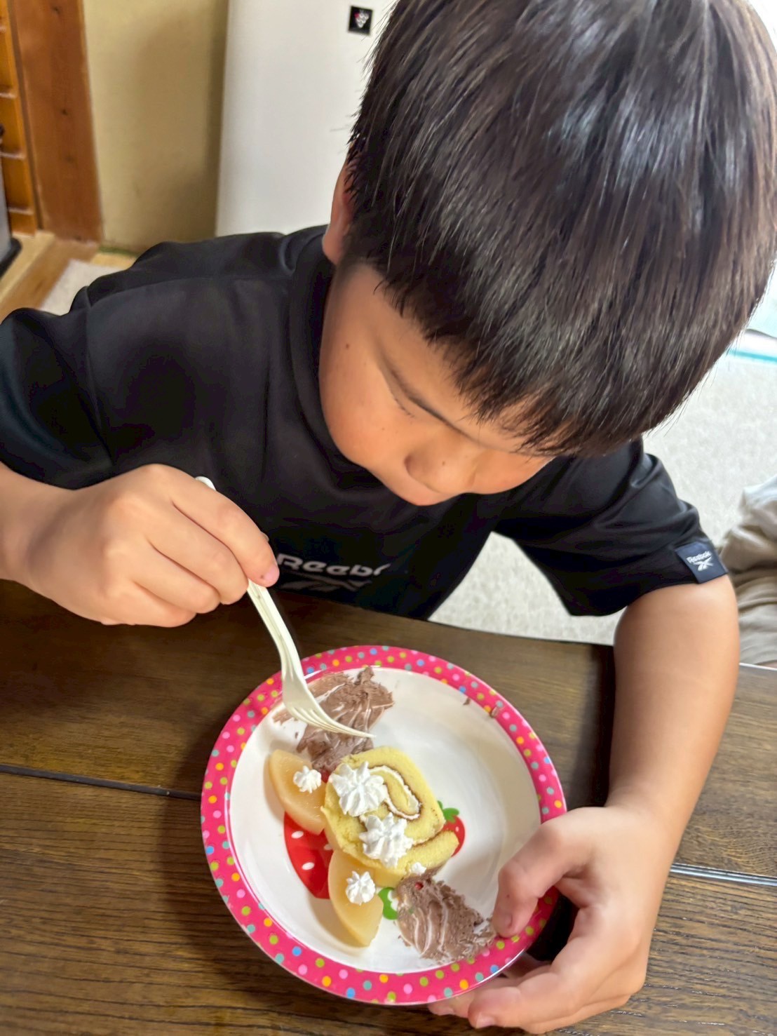 この日のおやつは、ロールケーキにホイップやフルーツ・お菓子をトッピング✨