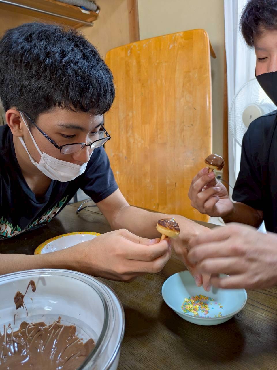 きつね色に焼けてきたら取り出し、湯煎したチョコで傘の部分をコーティング🍫