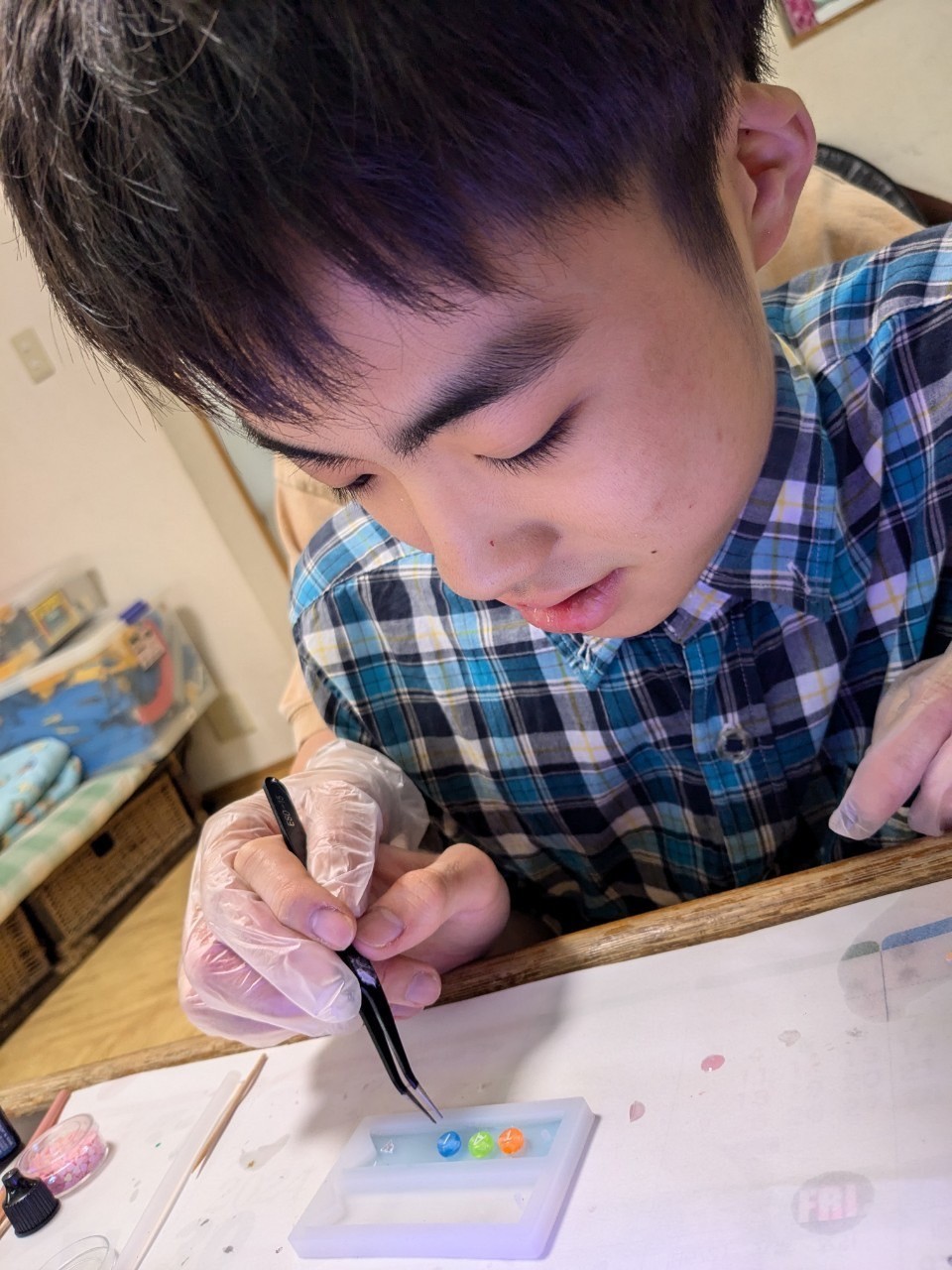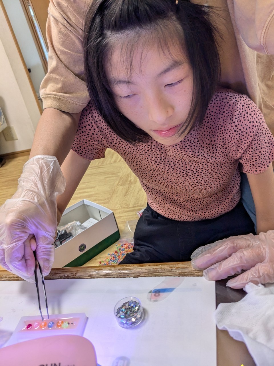 並べ終えたら上からさらにレジン液をかけてライトで硬化していきます!