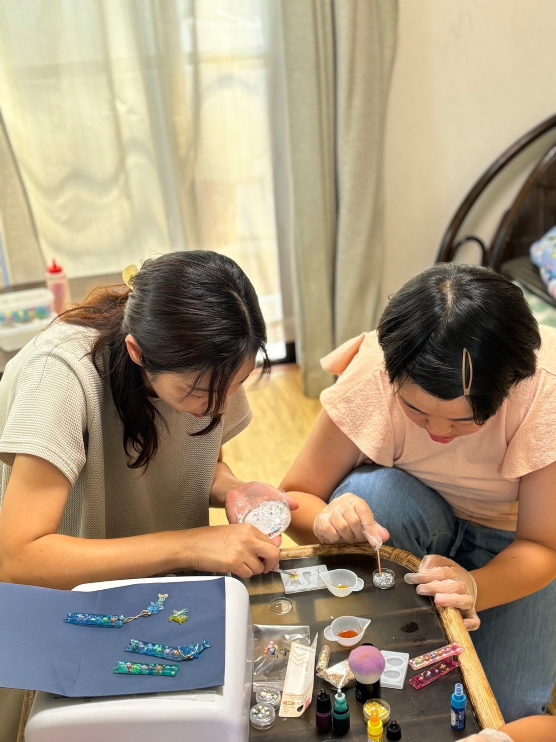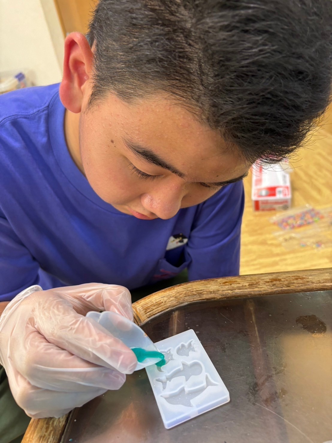 まずは着色したピンクorブルーのレジン液を型に流し入れます!