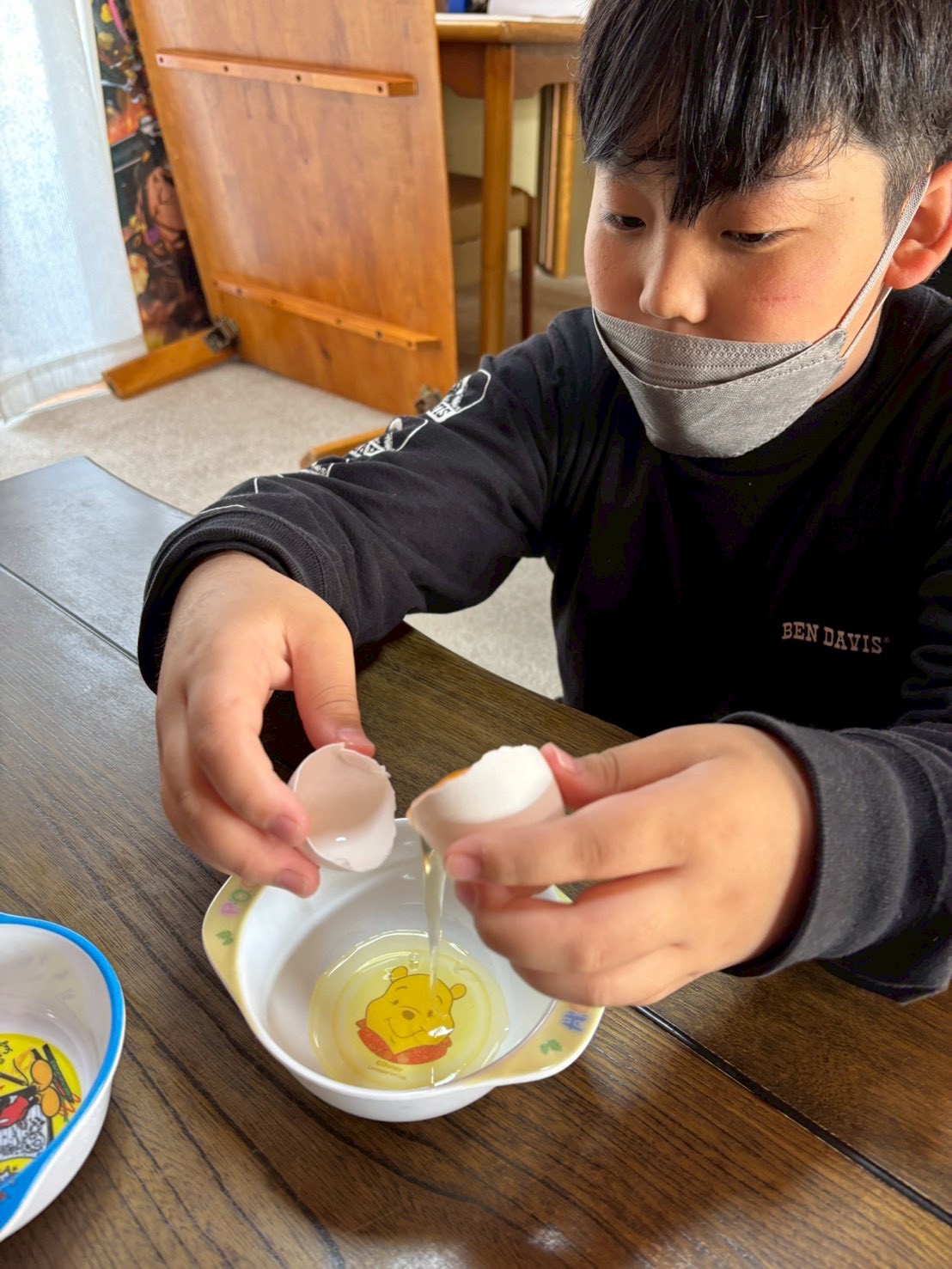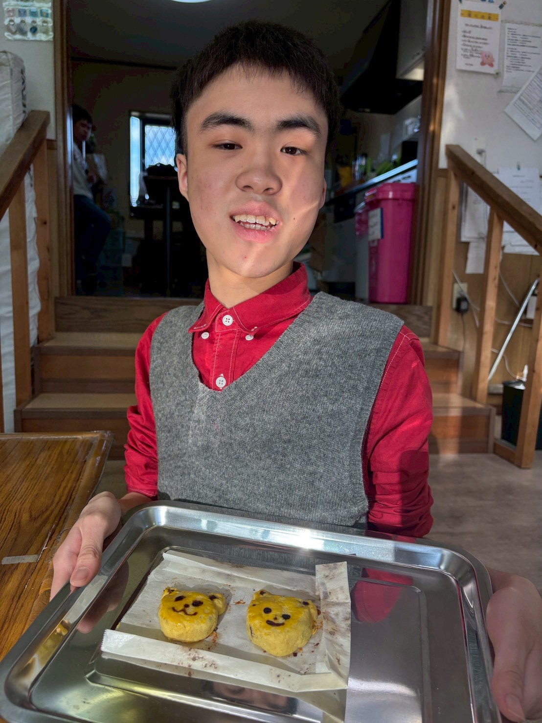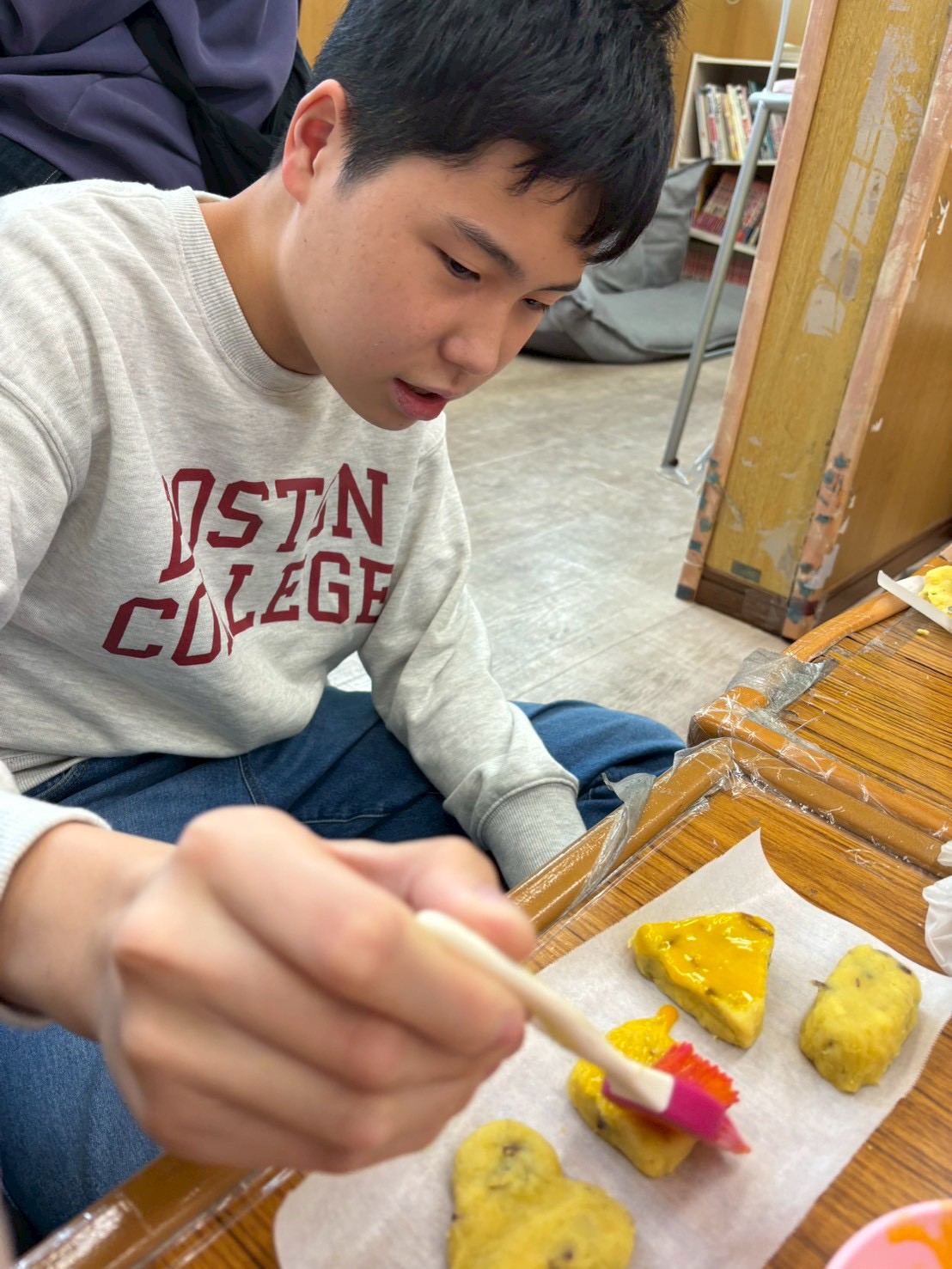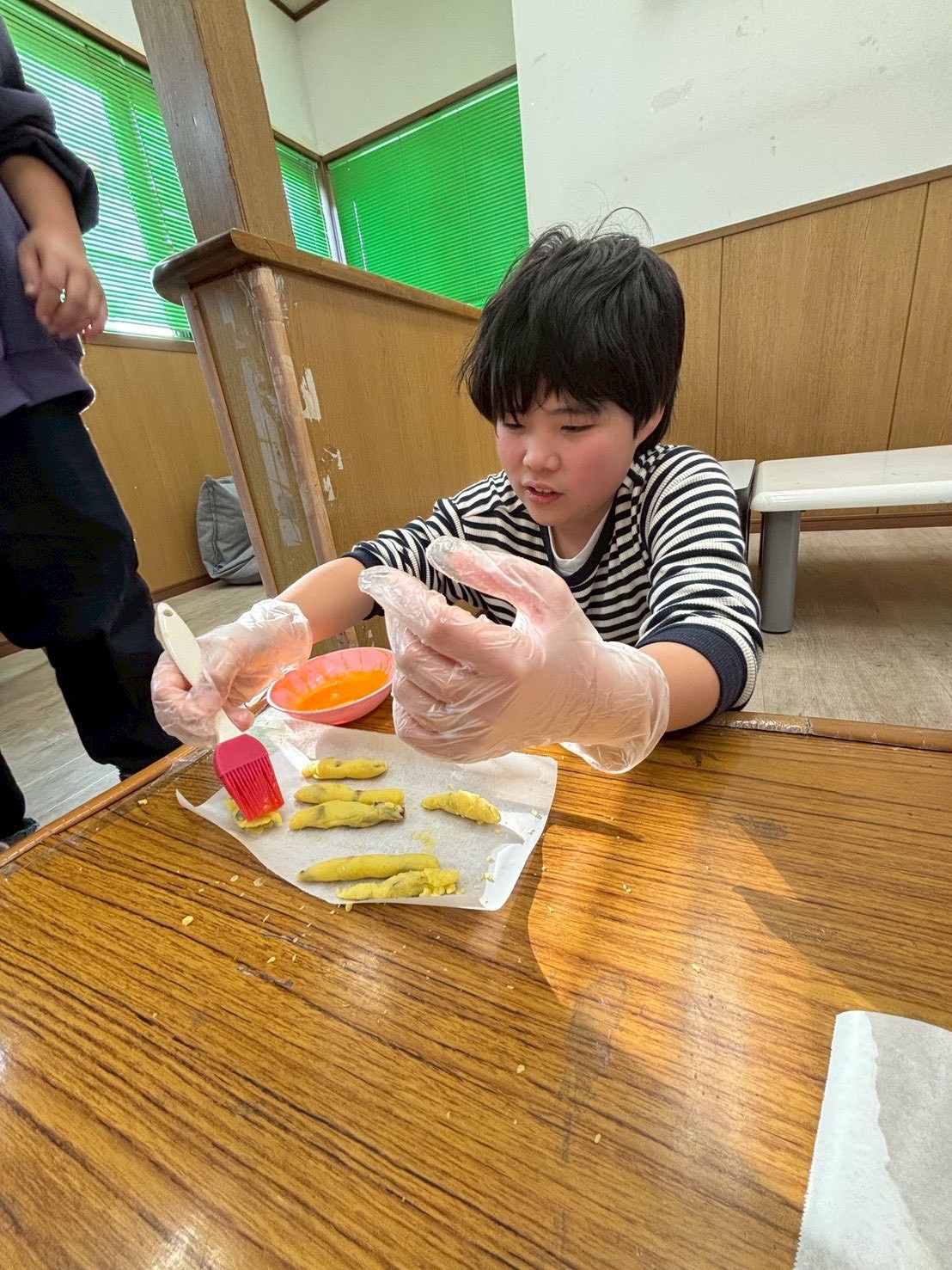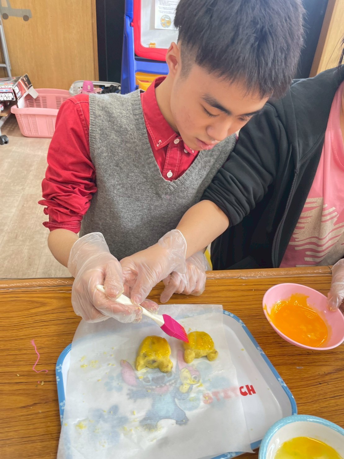 形が出来たら卵黄を塗り、180°に予熱したオーブンで、様子を見ながら15分ほど焼いていきます🎵だんだん甘くていい匂いがしてきました☺️早く食べたい!とみんな待ちきれない様子です😆
