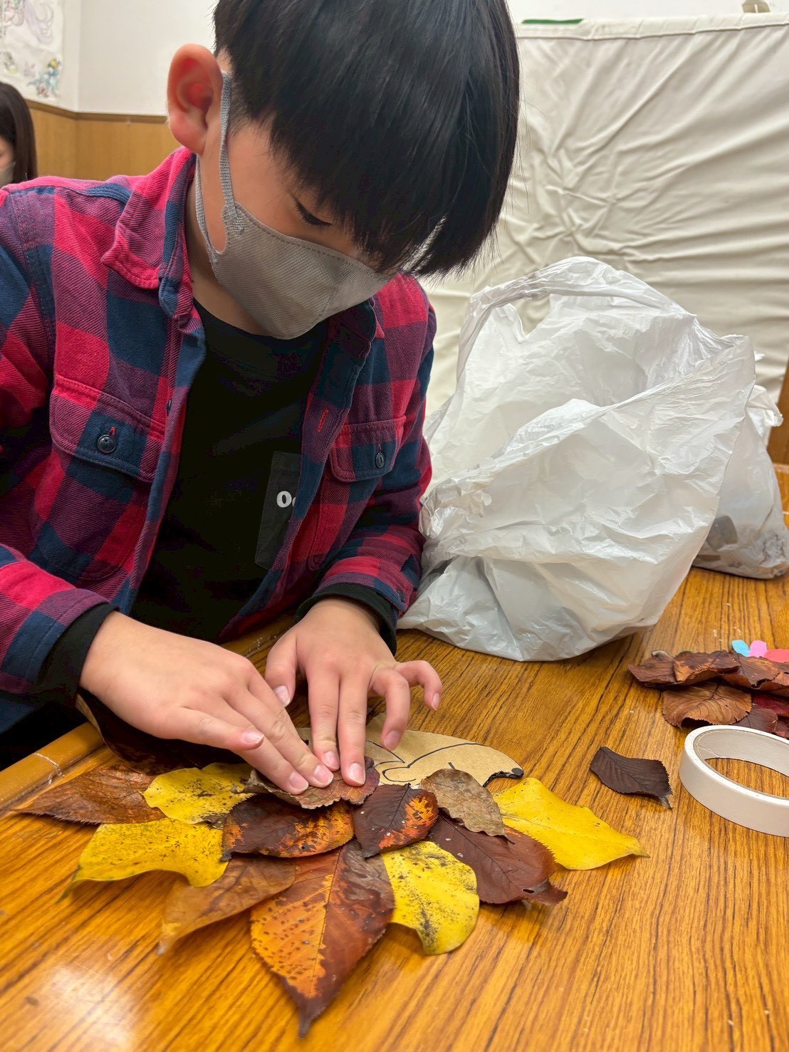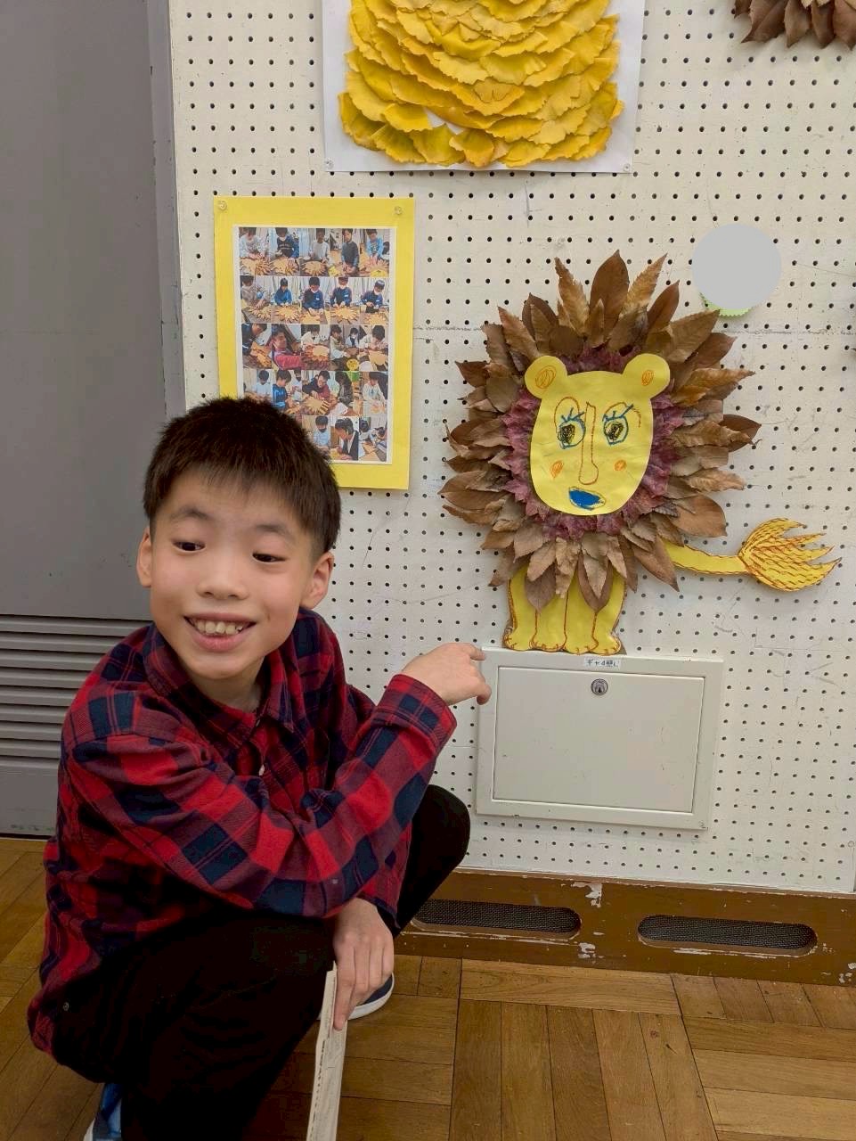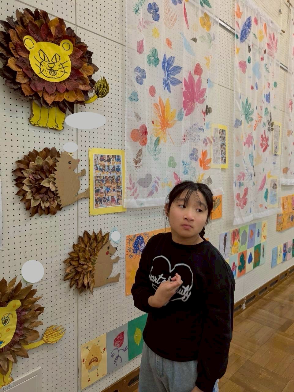 カーテンの両端には、葉っぱをたくさん使って作ったライオン・ハリネズミ、イチョウの葉のドレスをきたお姫様も展示✨みんなでコツコツと協力して制作し、見た目可愛いとっても素敵な作品に仕上がりました😆