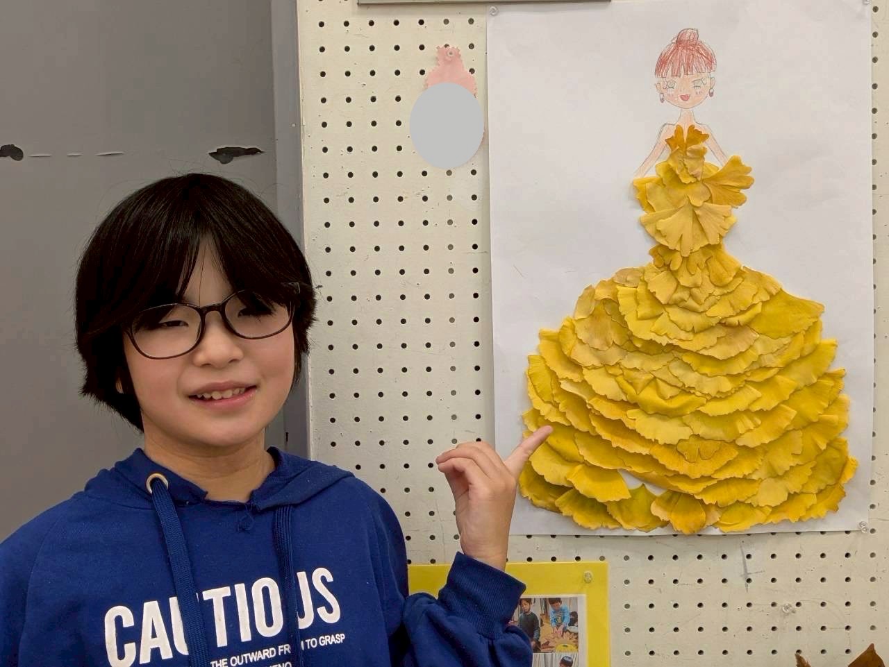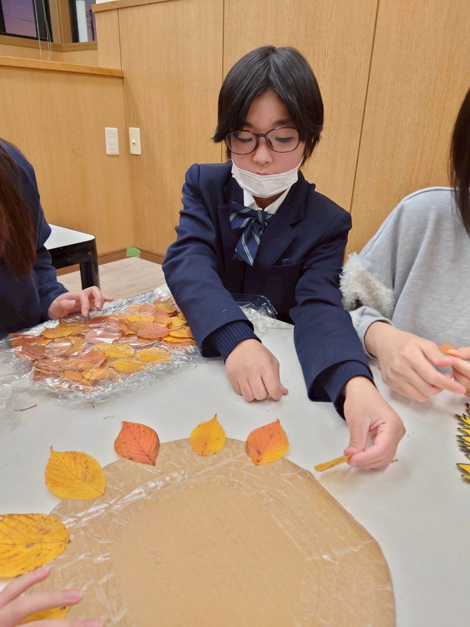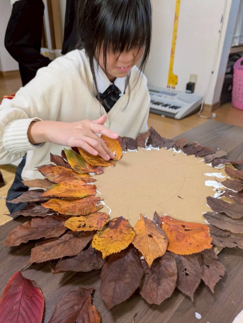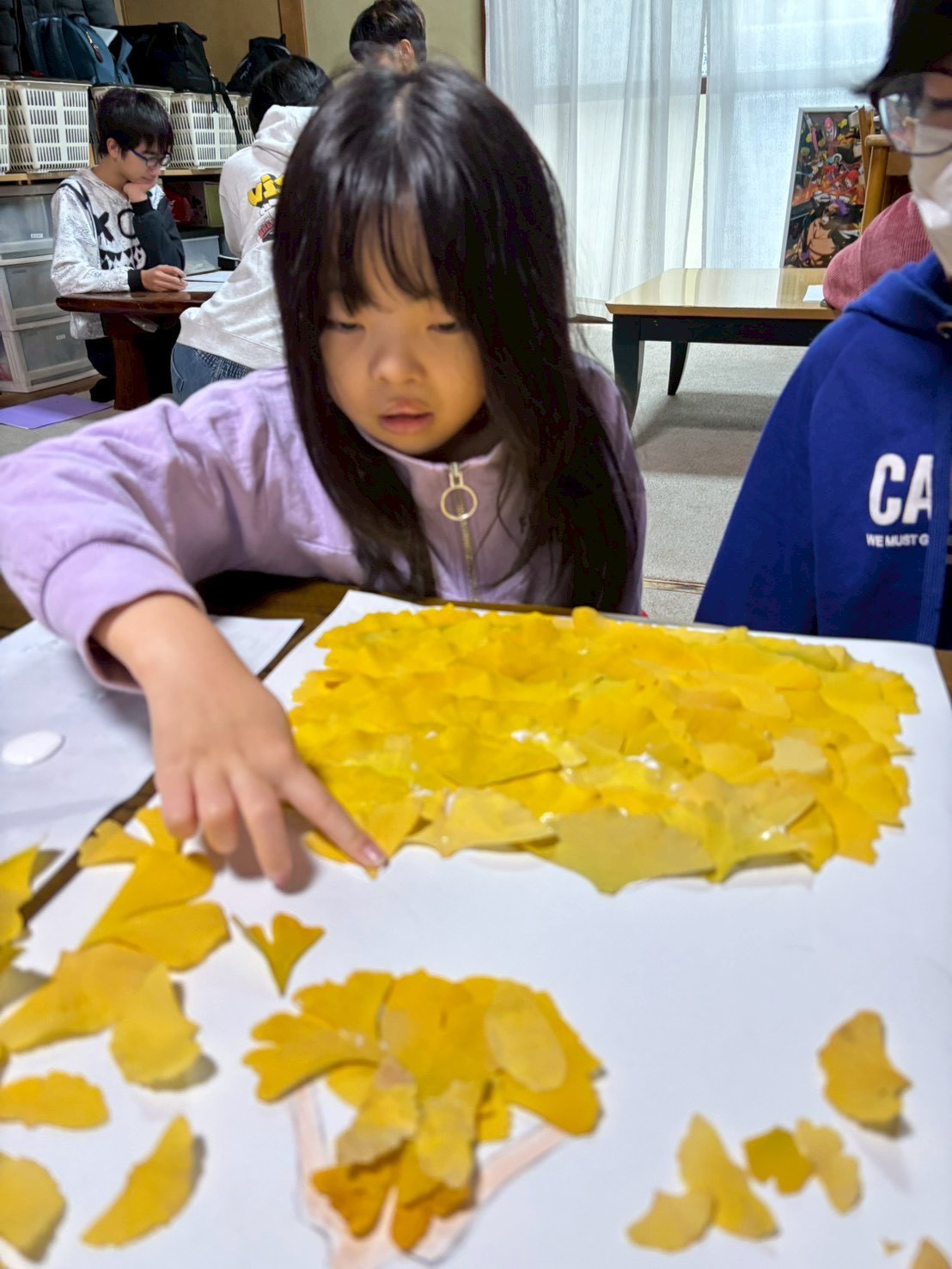 カーテンの両端には、葉っぱをたくさん使って作ったライオン・ハリネズミ、イチョウの葉のドレスをきたお姫様も展示✨みんなでコツコツと協力して制作し、見た目可愛いとっても素敵な作品に仕上がりました😆