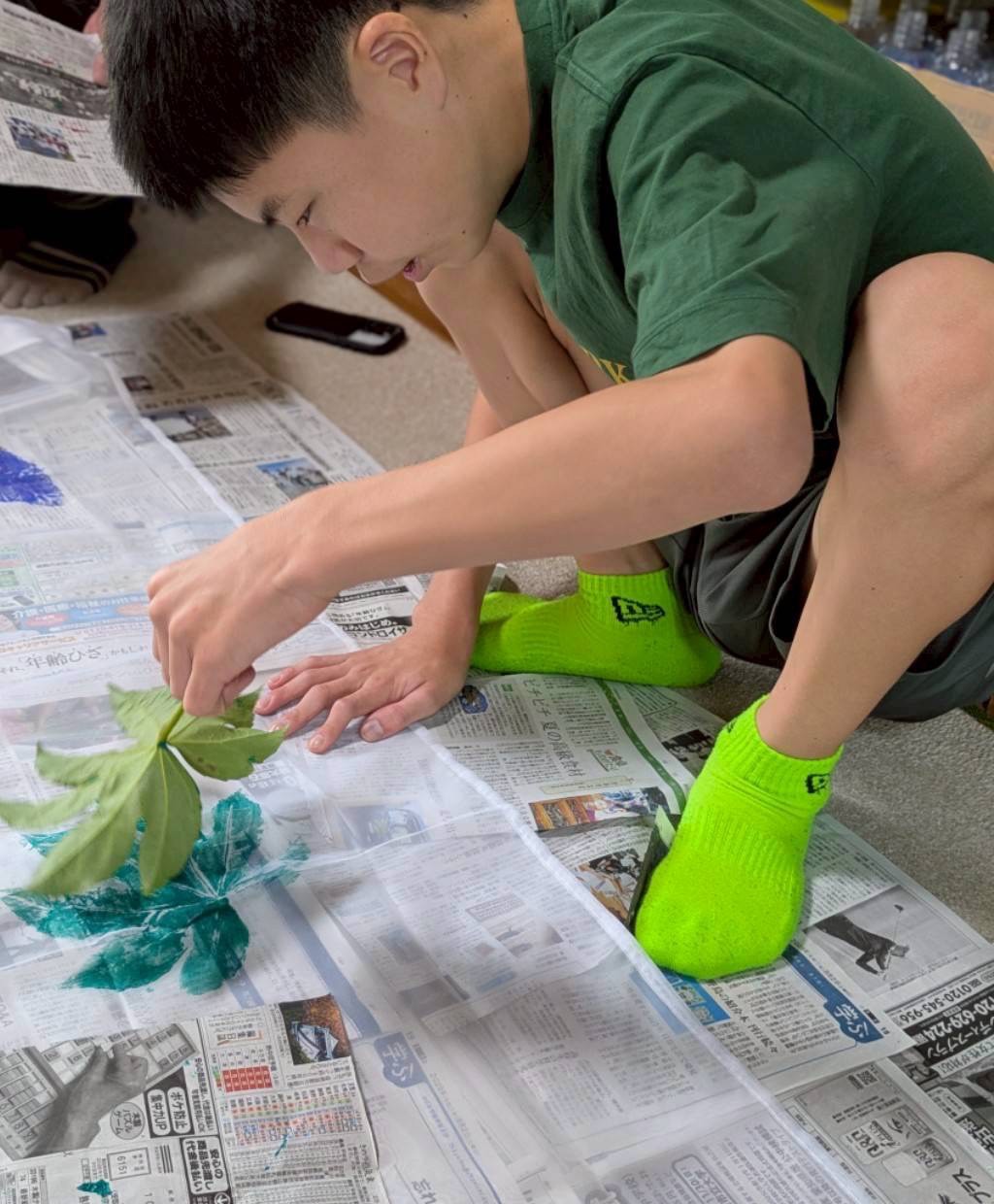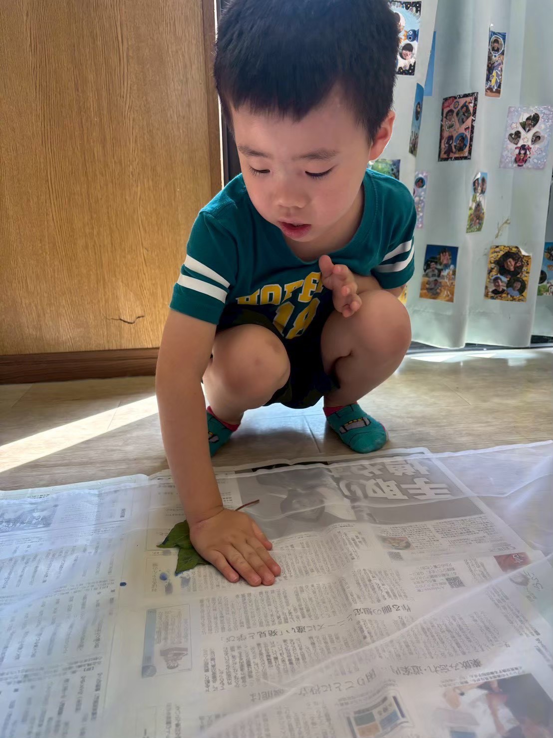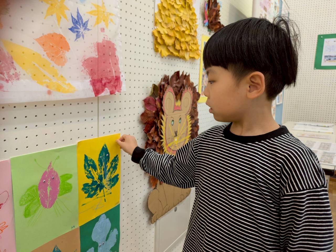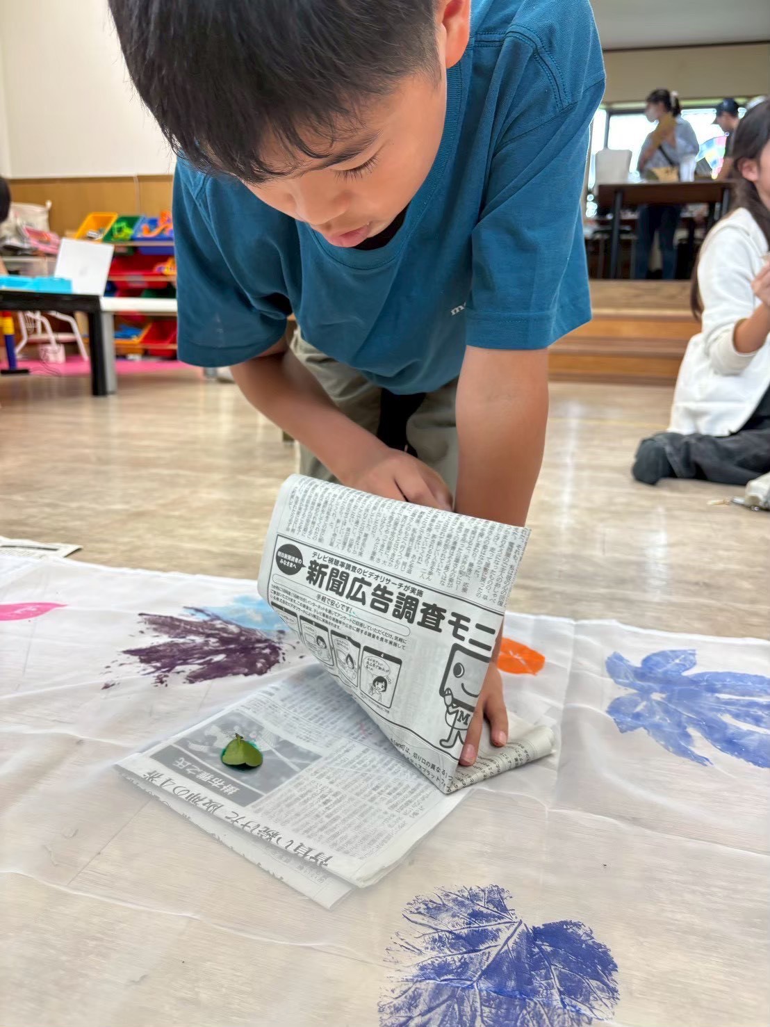 今回のひまわり作品展では、子どもたちが色々な種類の葉っぱを使って制作した大きな壁面作品を出展✨4枚のカーテンに葉っぱをスタンプして模様をつけたり、葉っぱのスタンプに顔や体を付け足して「おもしろ葉っぱ星人」にしたりと、ユニークで楽しい作品に仕上がりました😊