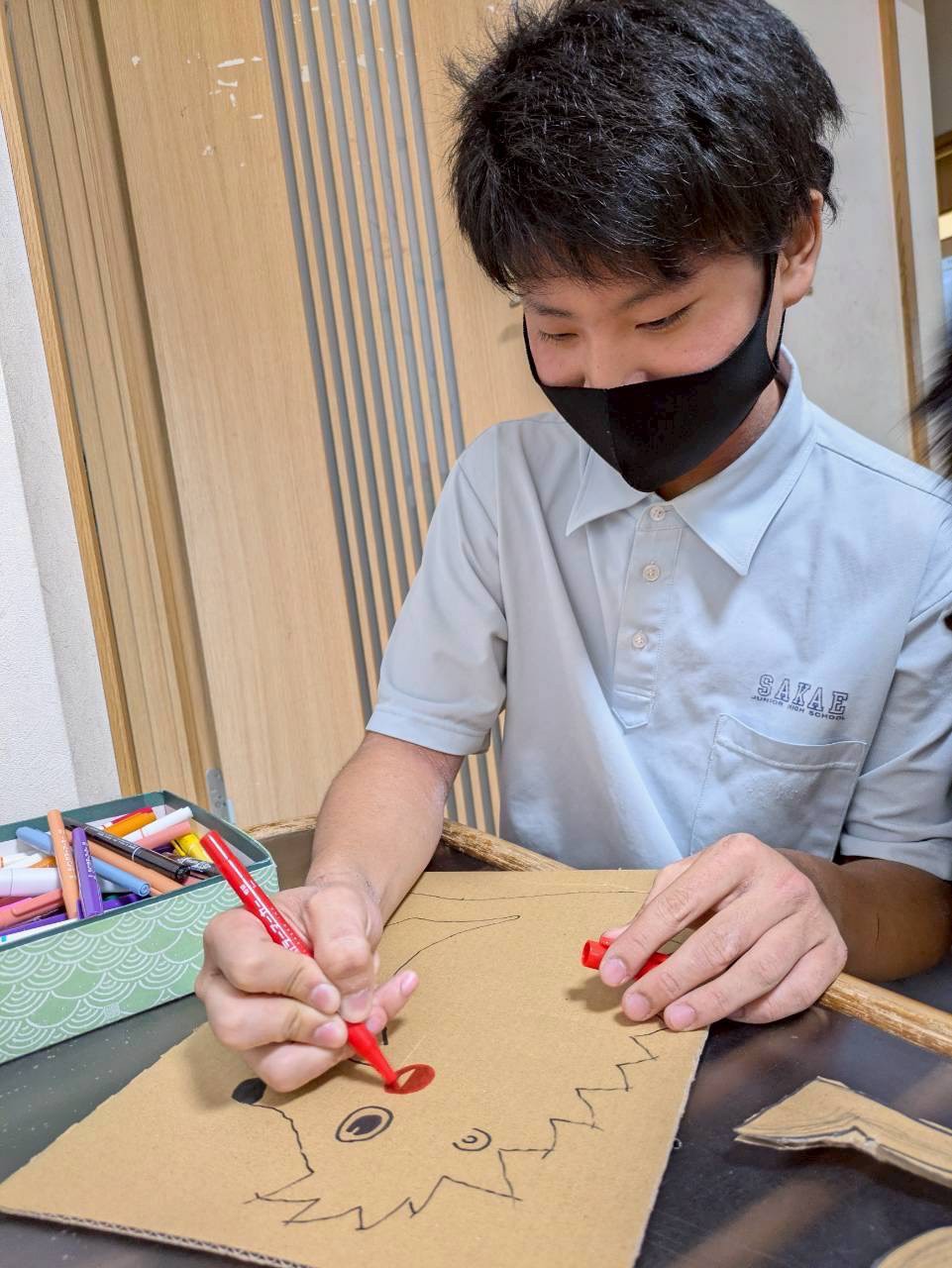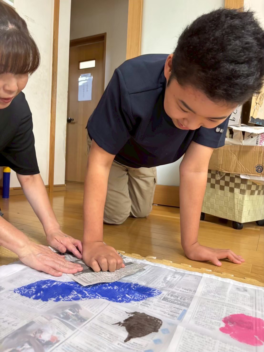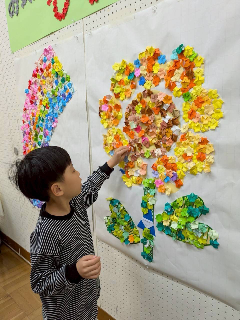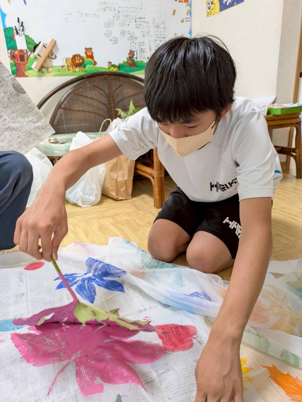 今回のひまわり作品展では、子どもたちが色々な種類の葉っぱを使って制作した大きな壁面作品を出展✨4枚のカーテンに葉っぱをスタンプして模様をつけたり、葉っぱのスタンプに顔や体を付け足して「おもしろ葉っぱ星人」にしたりと、ユニークで楽しい作品に仕上がりました😊