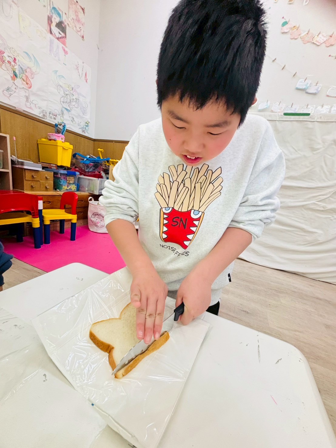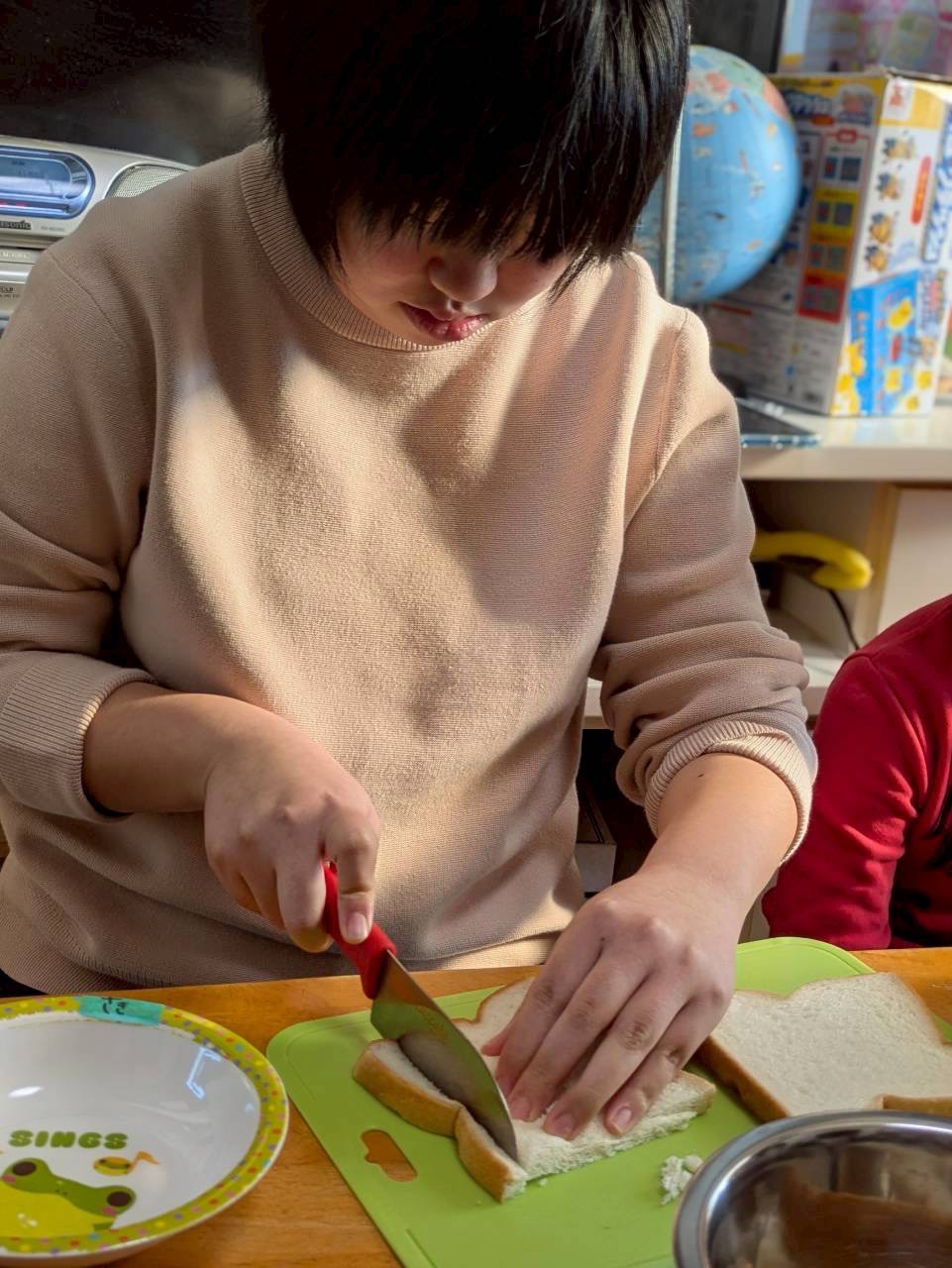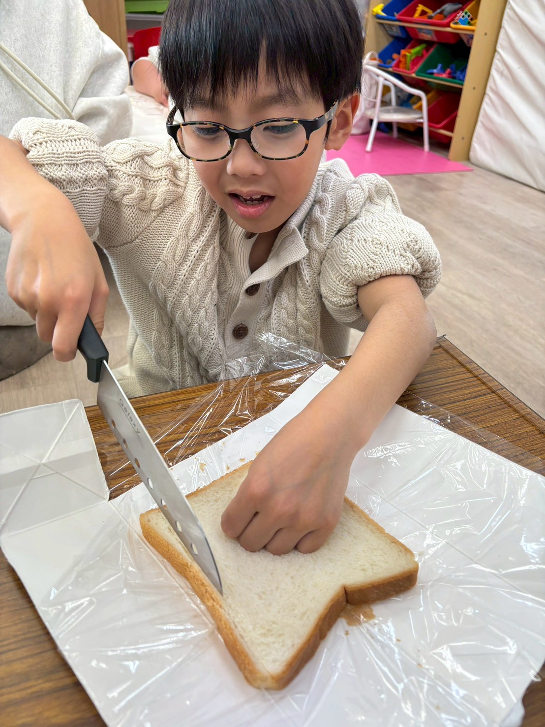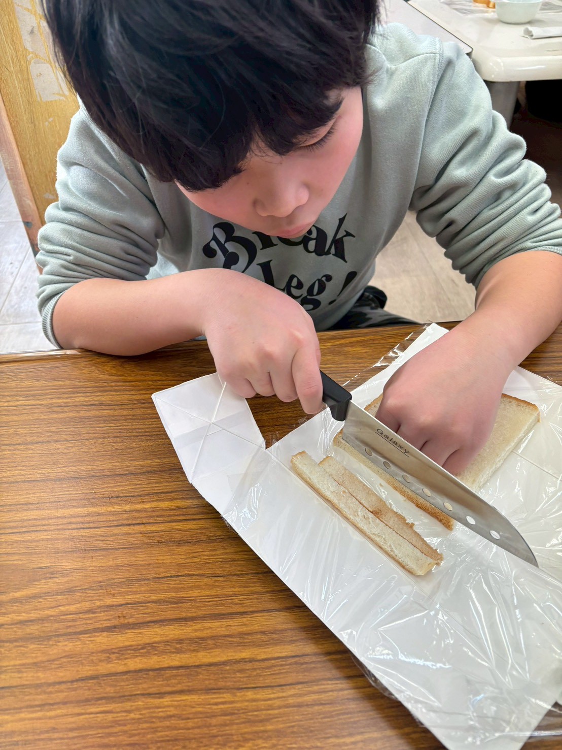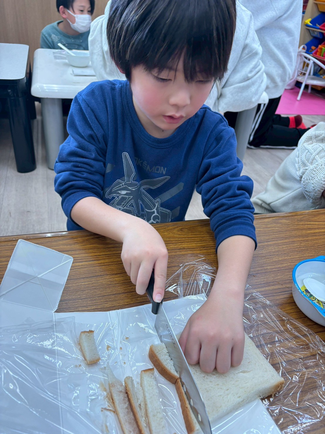 まずは食パンの耳をカット!みんな猫の手を意識してとっても上手に切ることができていました✨
