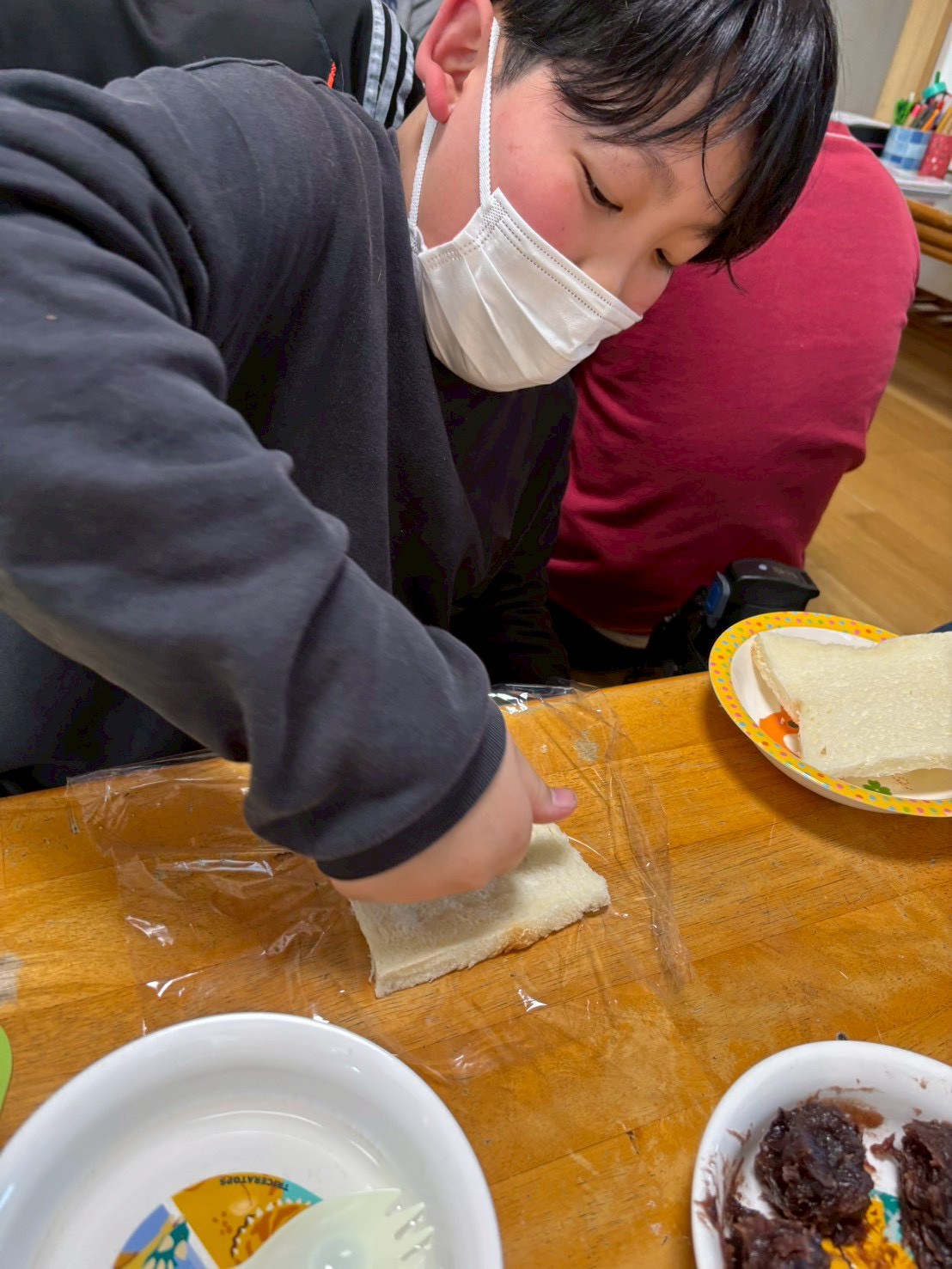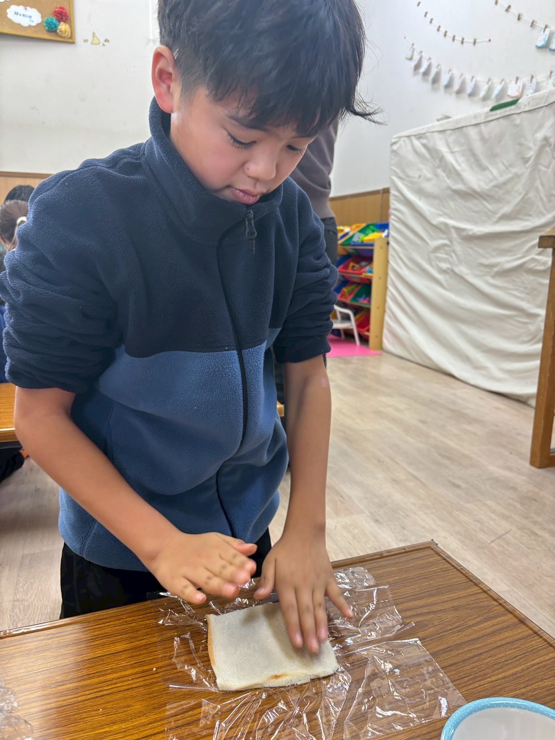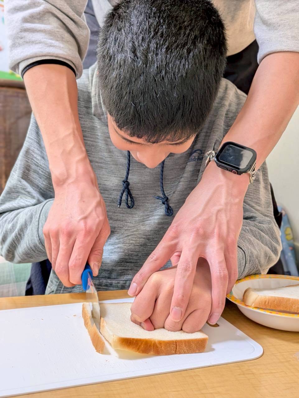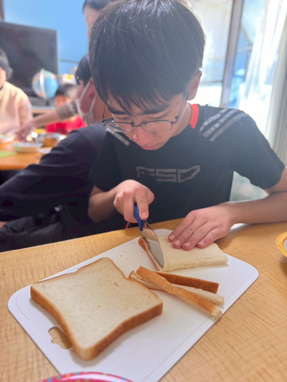 まずは食パンの耳をカット!みんな猫の手を意識してとっても上手に切ることができていました✨