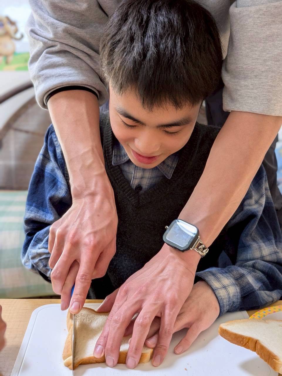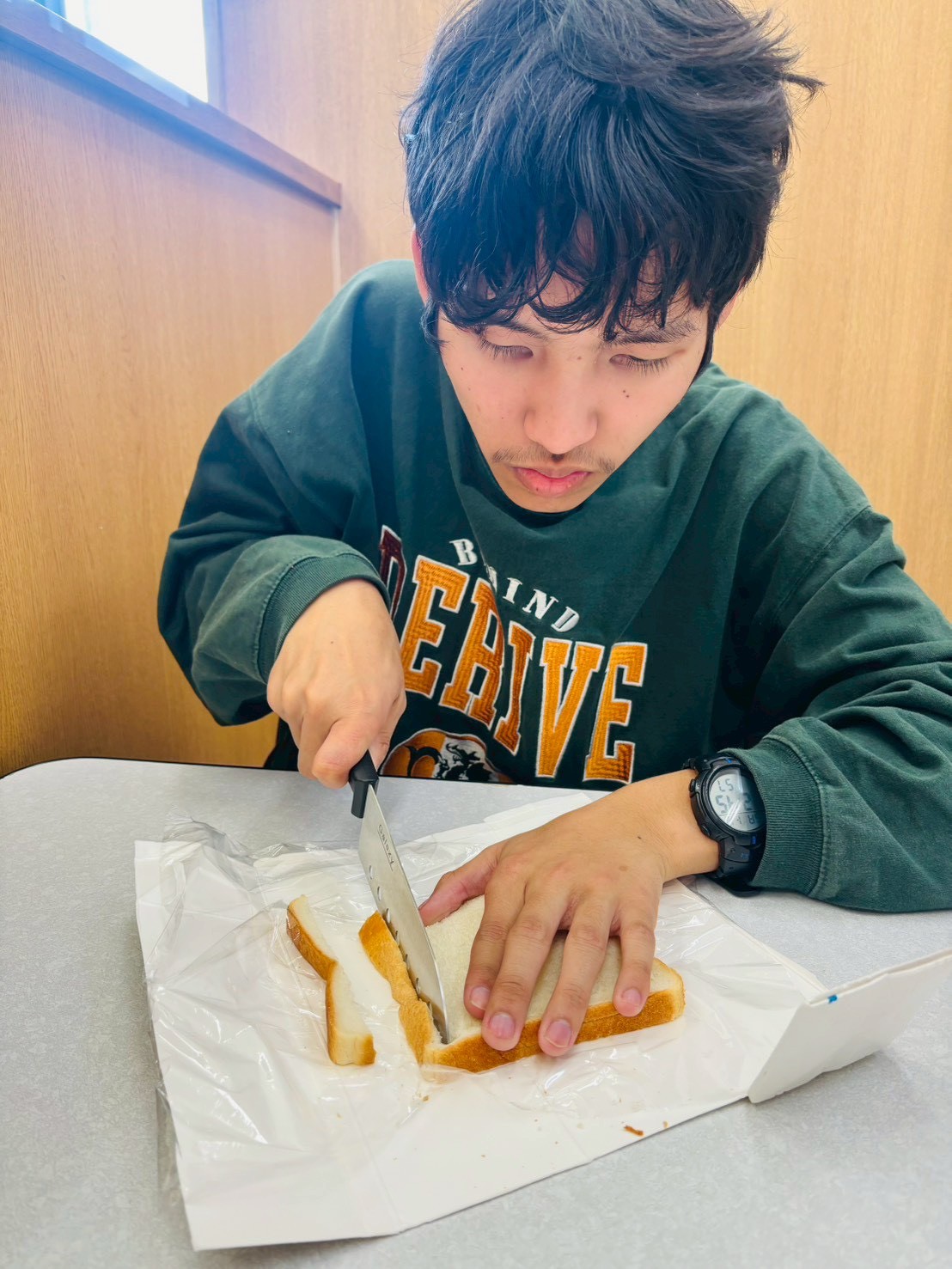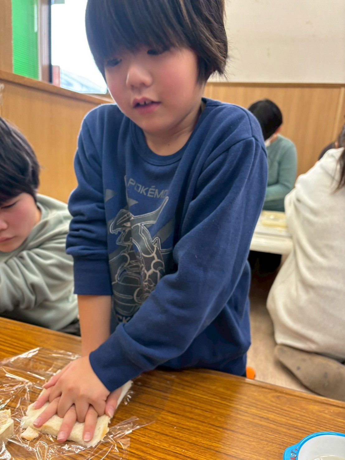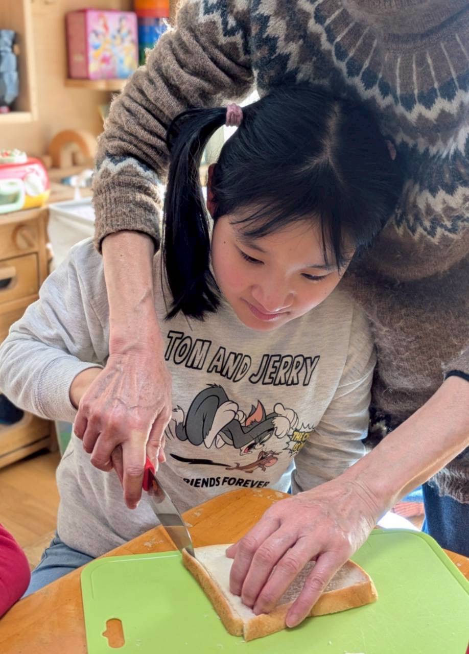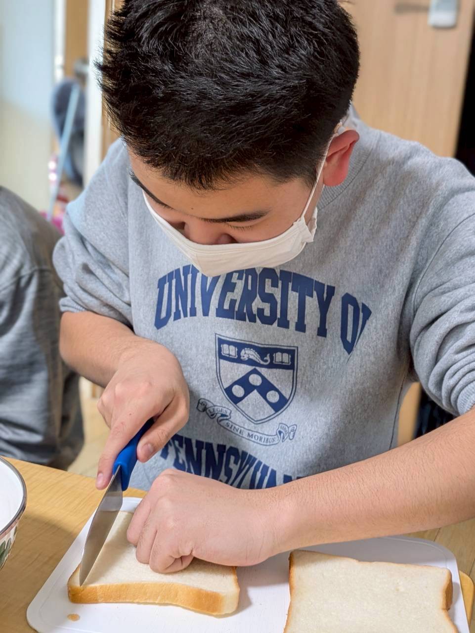 まずは食パンの耳をカット!みんな猫の手を意識してとっても上手に切ることができていました✨